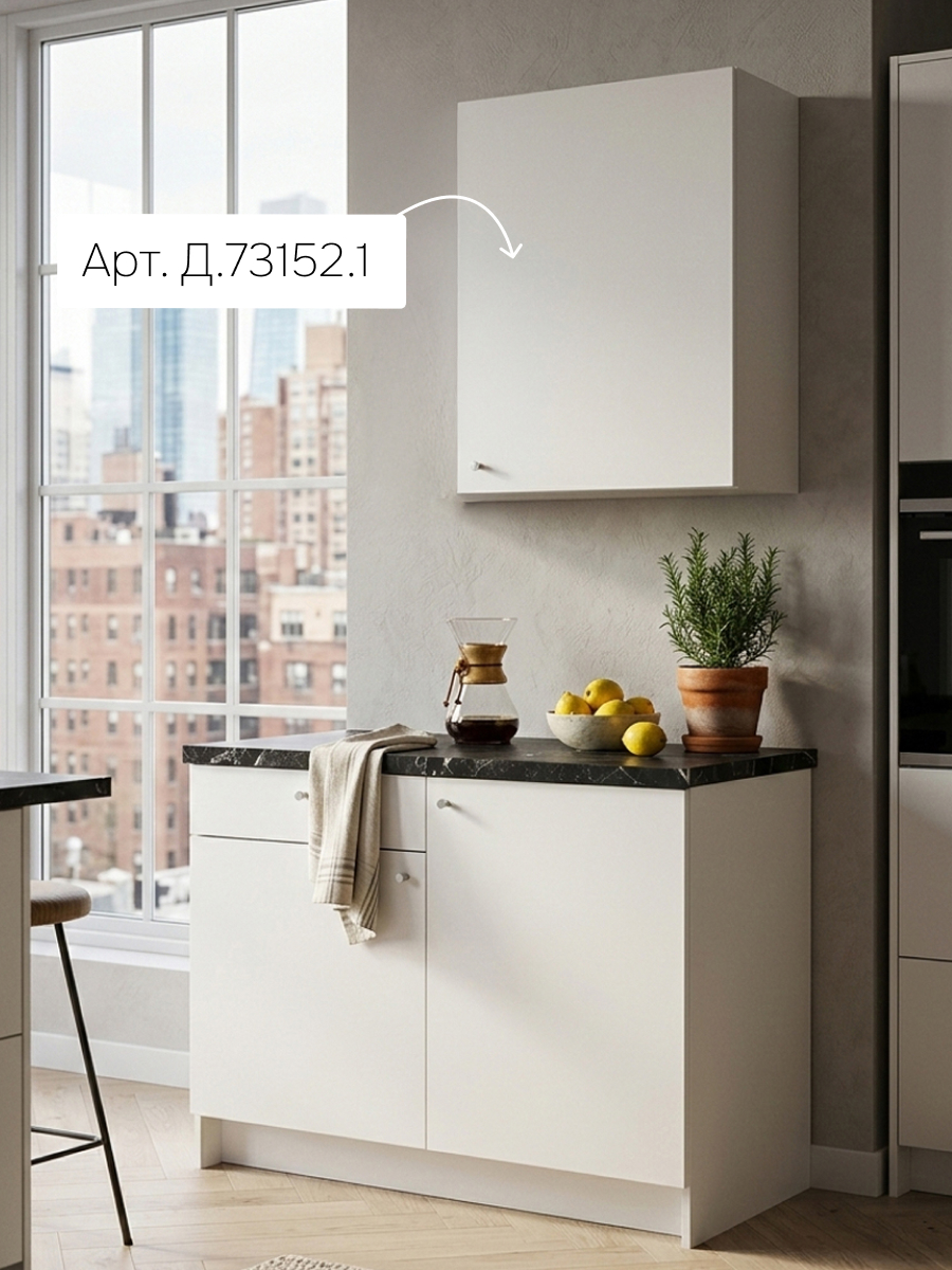 Скандинавский стиль: Белоснежный фасад с лаконичными линиями — визитная карточка белой кухни. Такое решение визуально расширяет пространство и наполняет его светом, что особенно ценно для небольших помещений. Модуль легко комбинируется с любыми столешницами и цветными акцентами.