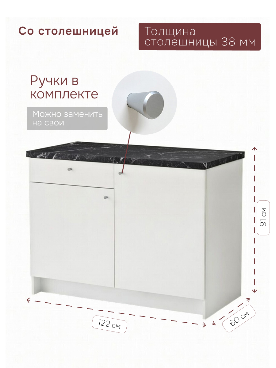 Вместительность и эргономика: Это идеальный выбор, если вы собираете кухонный гарнитур 120 см. Просторная тумба сочетает в себе два типа систем хранения: верхние ящики для столовых приборов и кухонной мелочи, а нижнее отделение с полками — для крупных кастрюль и сковородок.