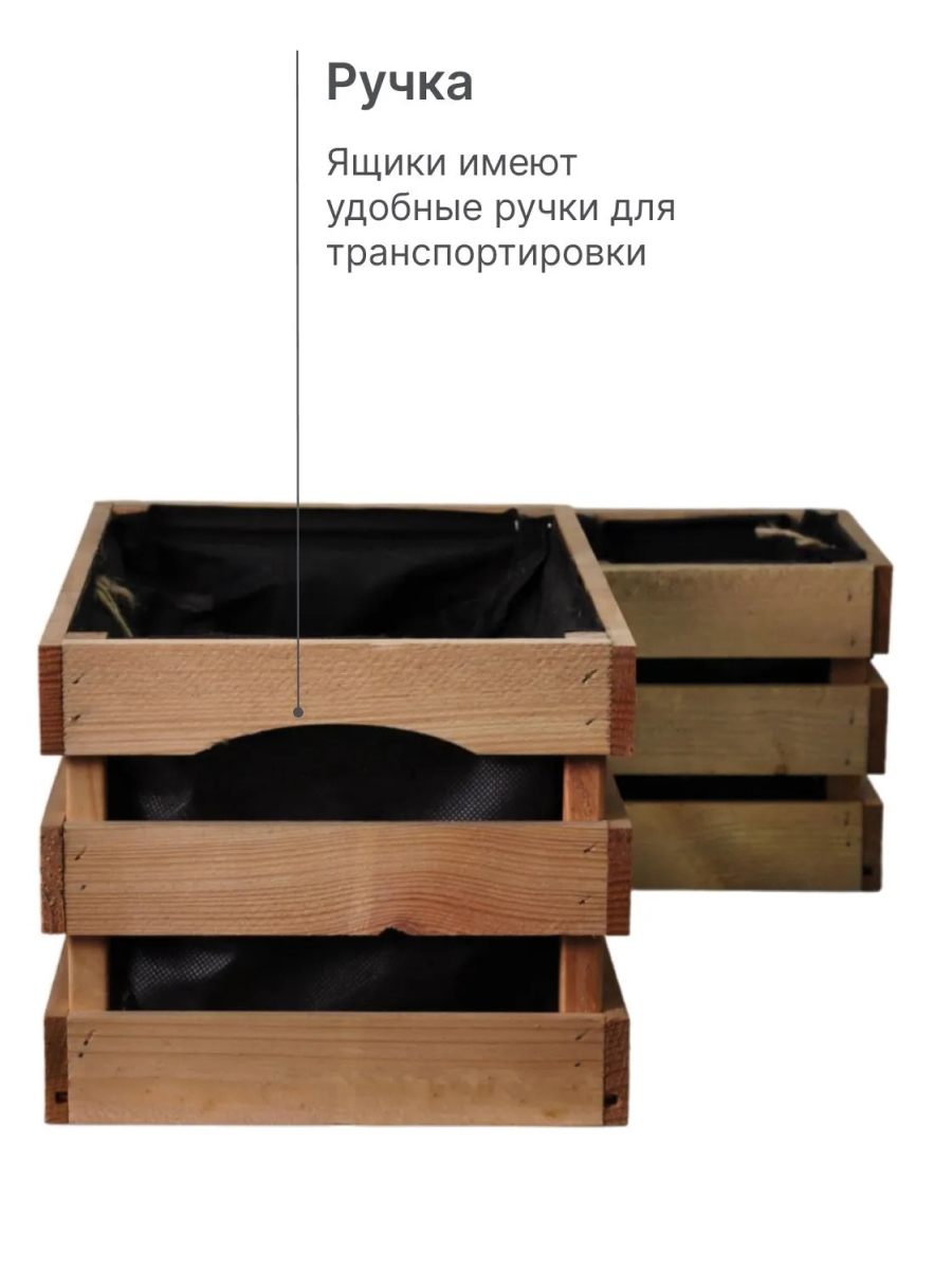 Набор ящиков от белорусского производителя ООО "Диприз" изготовлен из натурального дерева - массива сосны. Ящики из сосны, обитые внутри биотканью. Материал хорошо переносит к перепаду температур и устойчив к выгоранию от солнечного света.
