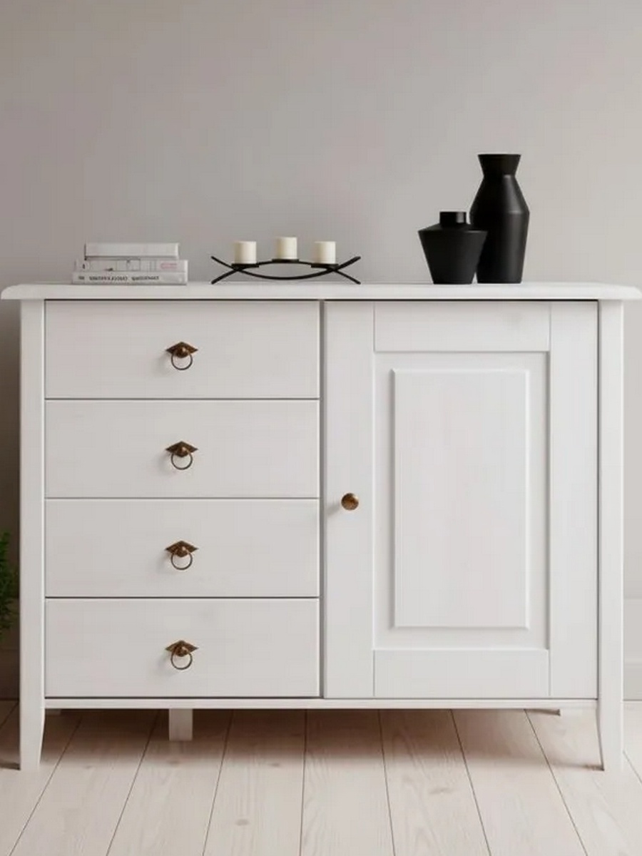 Идеальная тумба для помещений, где важен каждый сантиметр. Модель шириной 103 см из массива сосны с 4 ящиками и дверцей эффективно организует пространство в небольшой прихожей, узкой спальне или уютной гостиной. Сохраняет все преимущества классического дизайна и натуральности дерева.