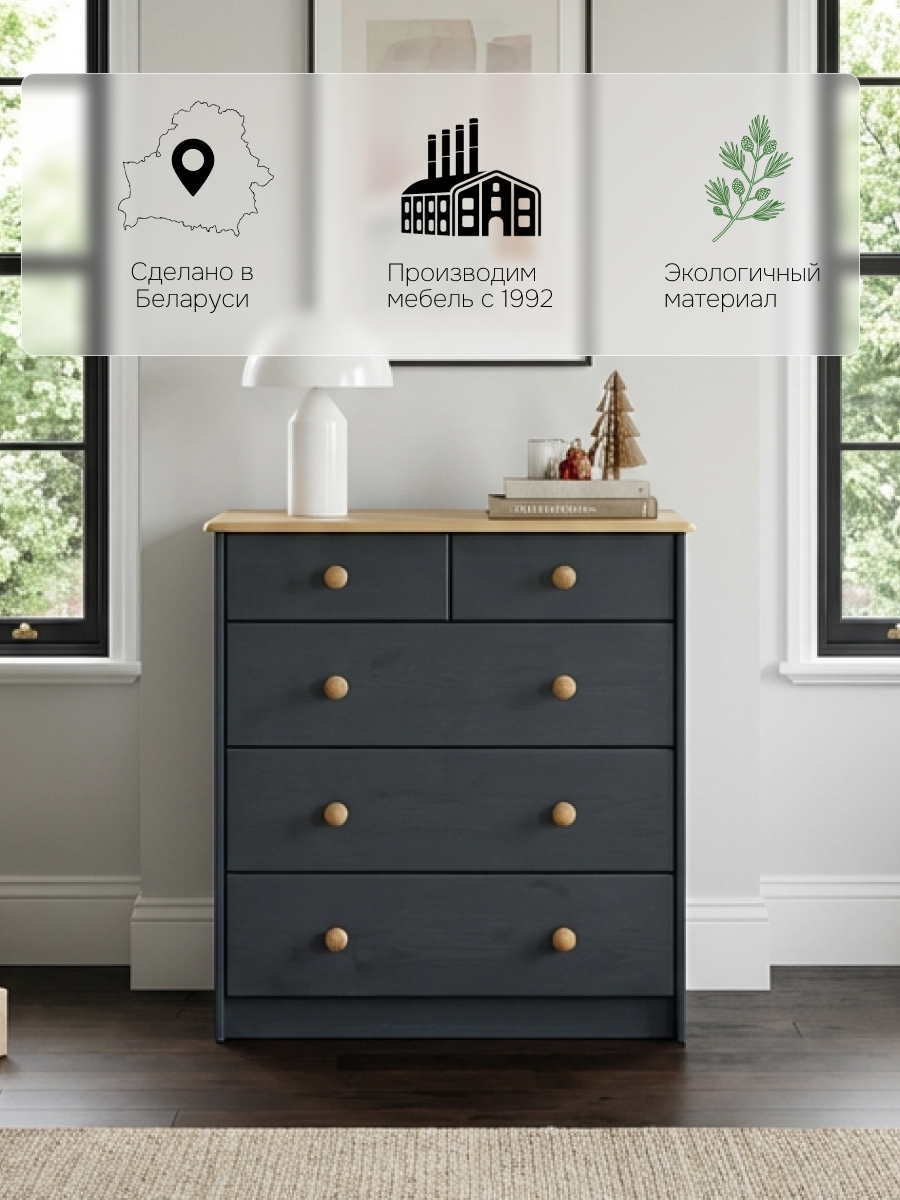 Комод HABA из массива сосны | Устойчив к влаге/температуре | Надежные роликовые направляющие | 5 ящиков | Экологичная мебель