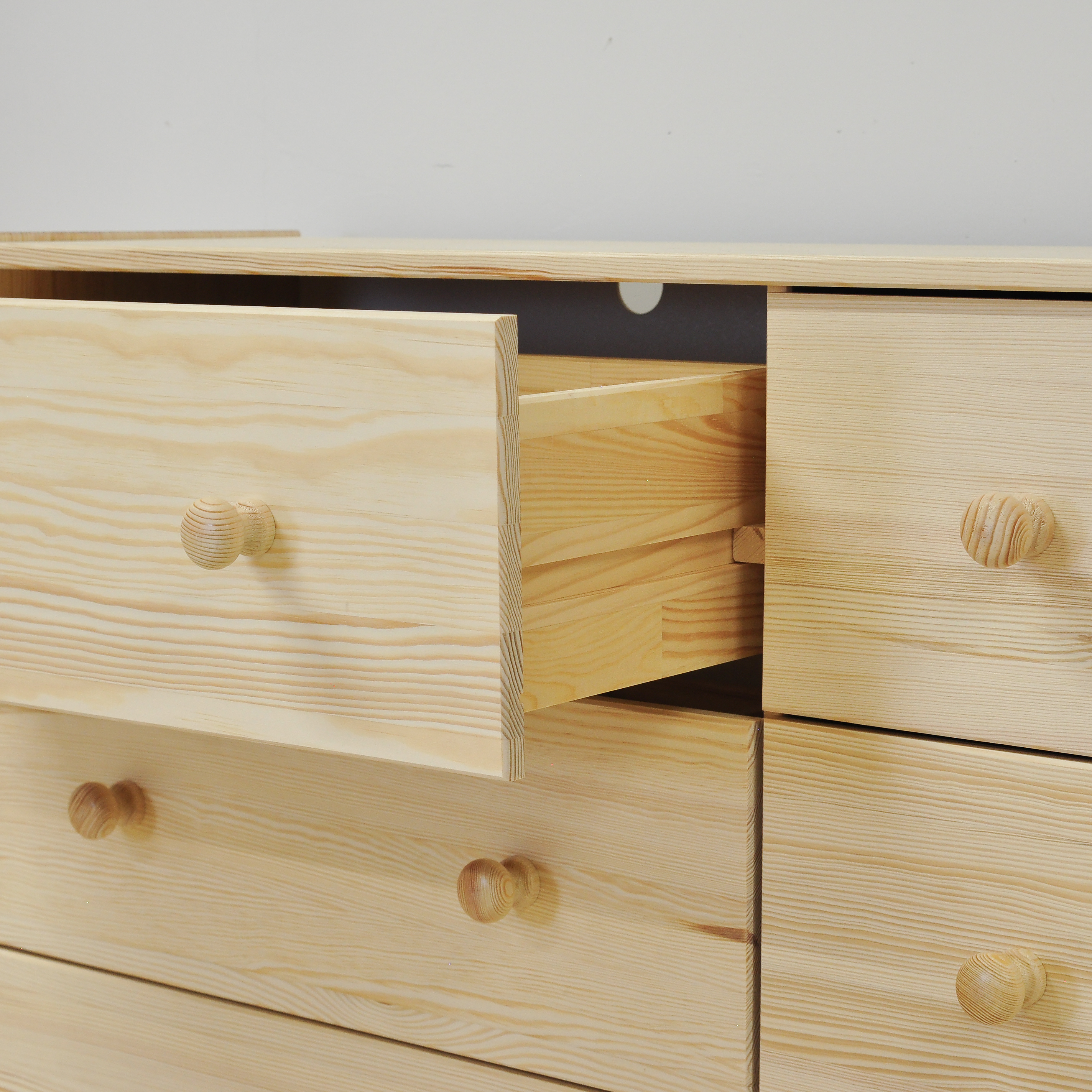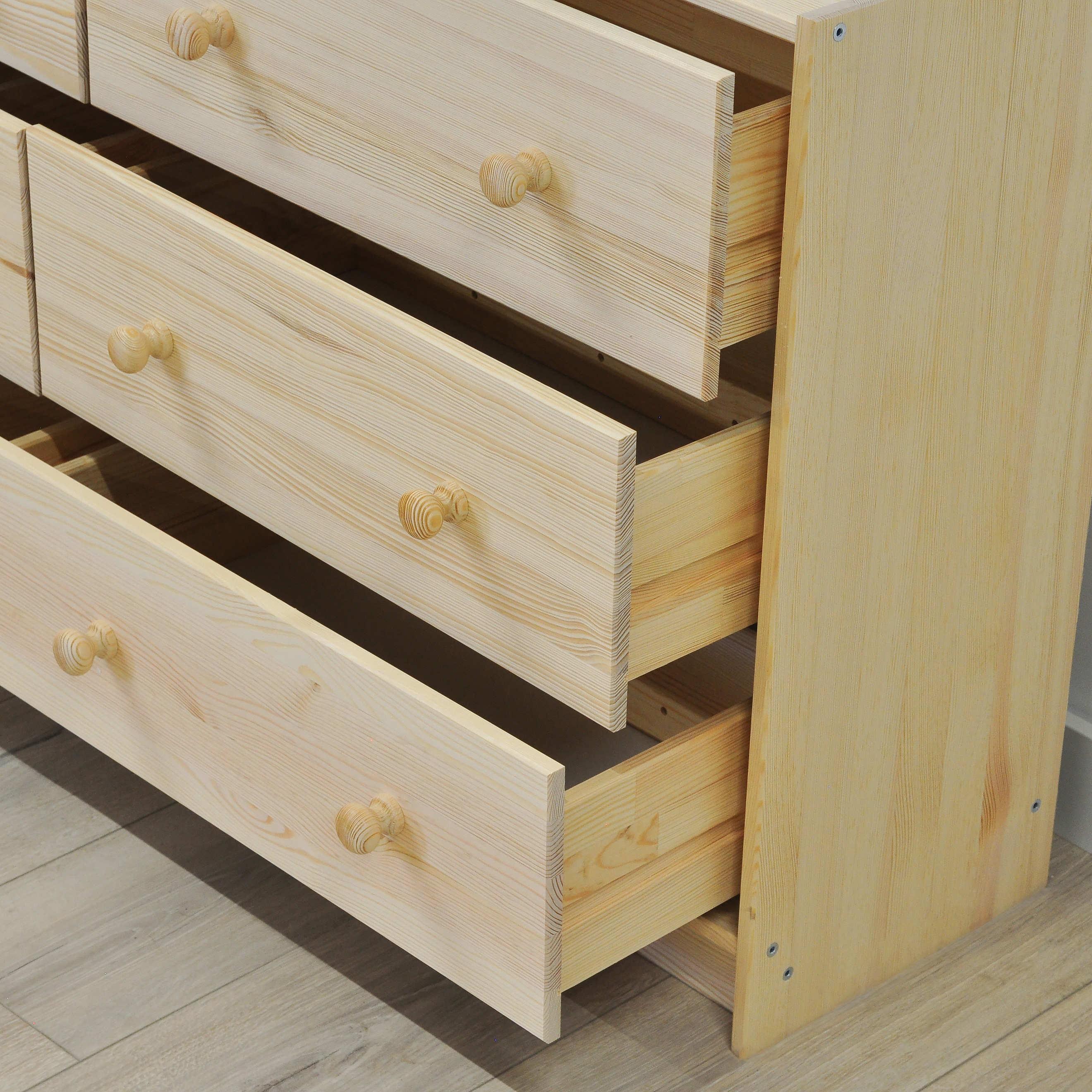 Комод Раст от белорусского производителя Dipriz изготовлен из экологически чистого материала – натурального дерева массива сосны, которое отличается высокой прочностью и долговечностью. Наш комод для одежды это удобный и функциональный предмет мебели. Он выполнен из натурального массива сосны и имеет 6 вместительных ящиков с деревянными направляющими.
