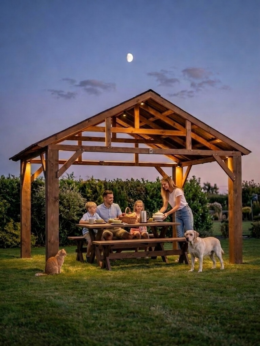 - Идея трансформации – легко превратить в закрытый павильон: застеклите стены, и получится современное пространство в стиле лофт или барнхаус