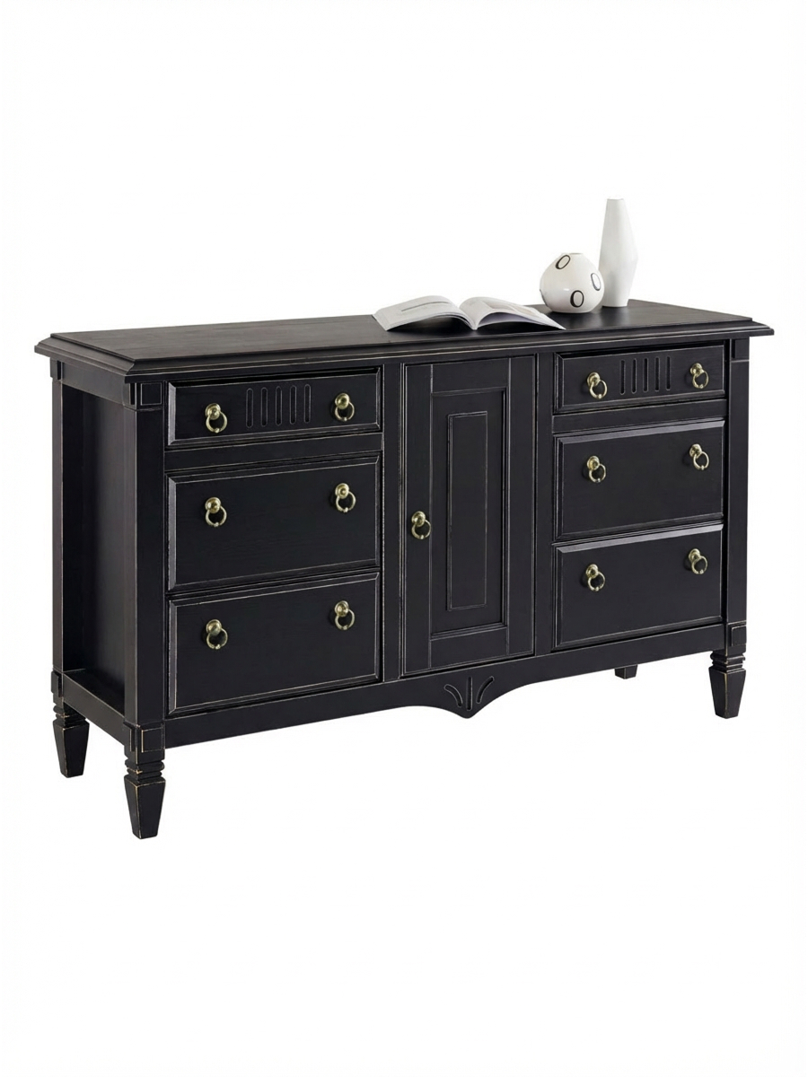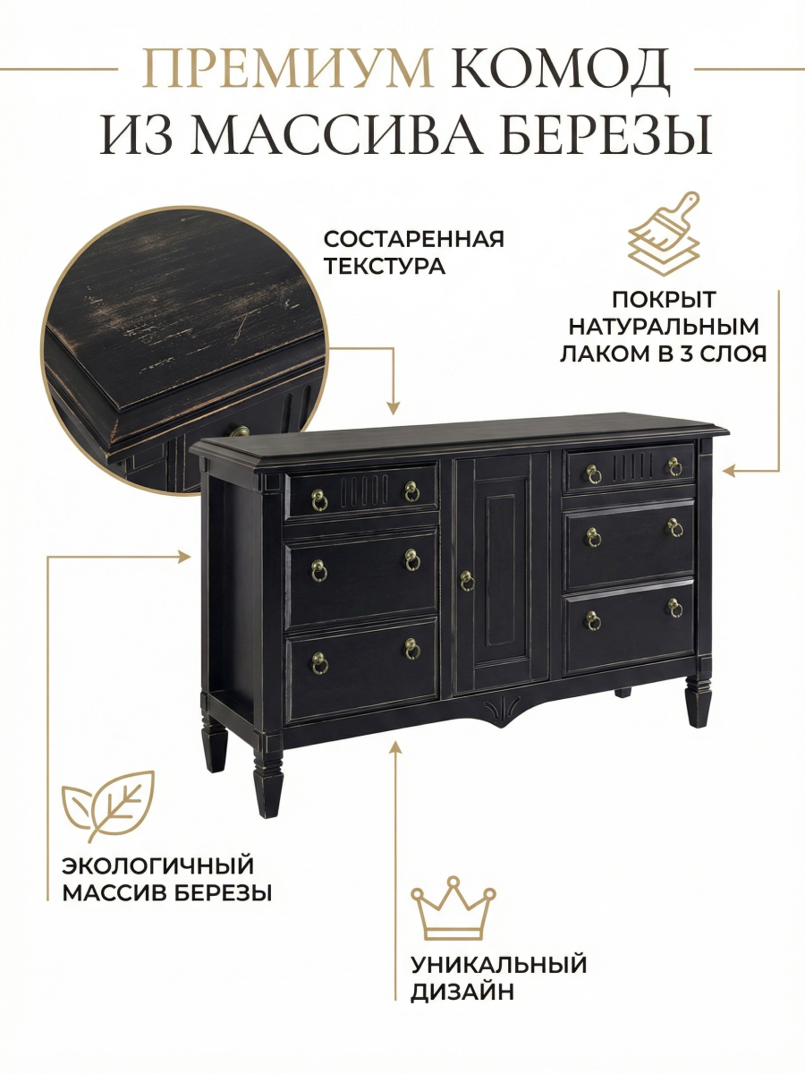 Комод 160х50х94, Джоли, с шестью ящиками для одежды, в спальню, прихожую, гостиную, массив березы, черный, Makosa