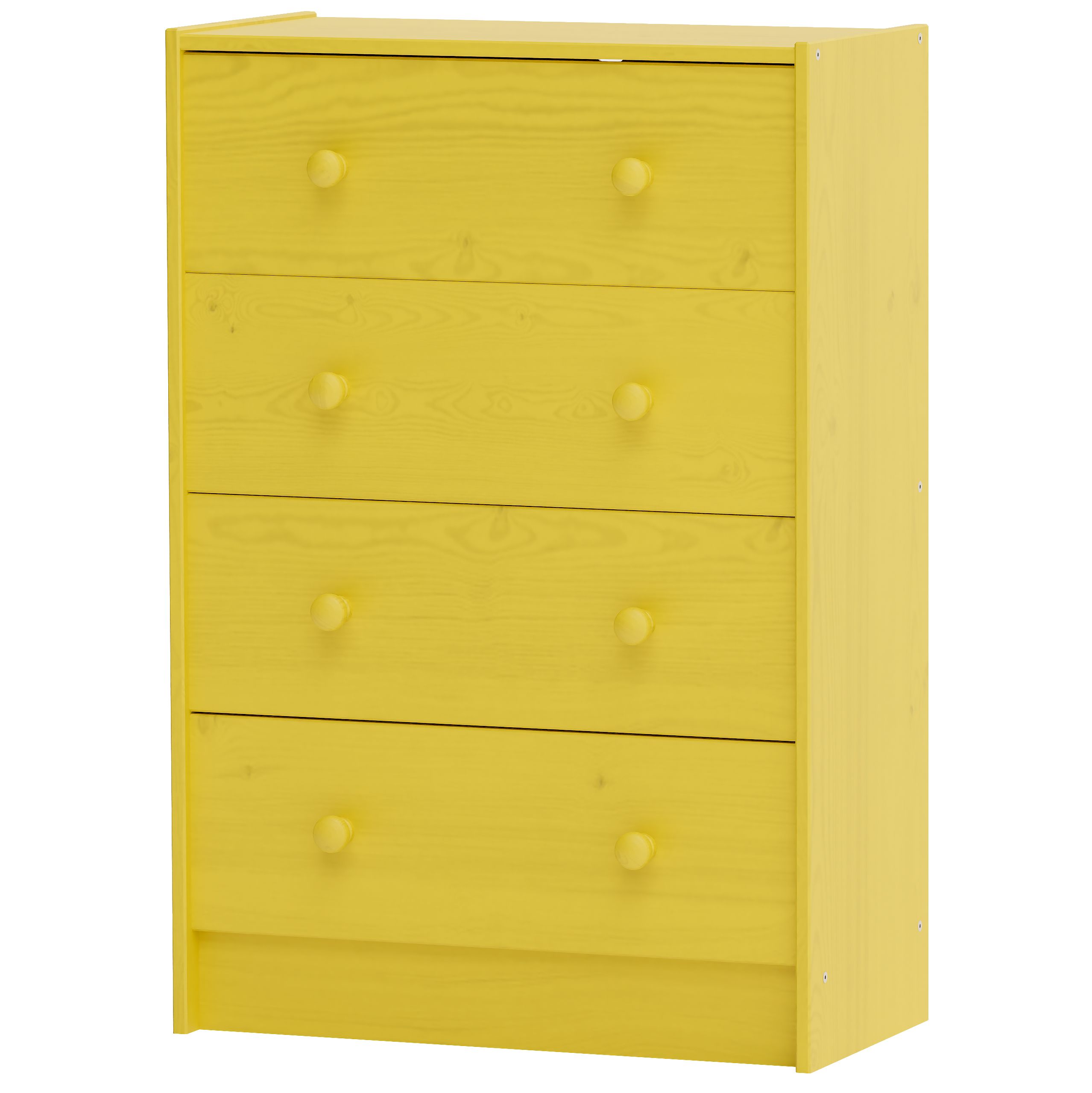 Желтый комод для вещей Раст от белорусского производителя мебели изготовлен из экологически чистого материала - натурального дерева массива сосны, которое отличается высокой прочностью и долговечностью. Комод включает 4 выдвижных ящика с роликовыми направляющими.