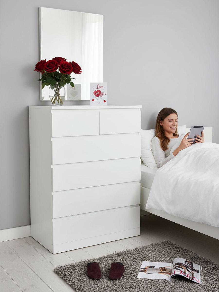 Этот высокий комод оснащен разделителями для ящиков, чтобы вы могли организовать ваши вещи максимально удобно. В комплекте к комоду прилагается 5 перегородок для ящиков, которые Вы можете установить в Ваш комод белый с ящиками в любом ящике.