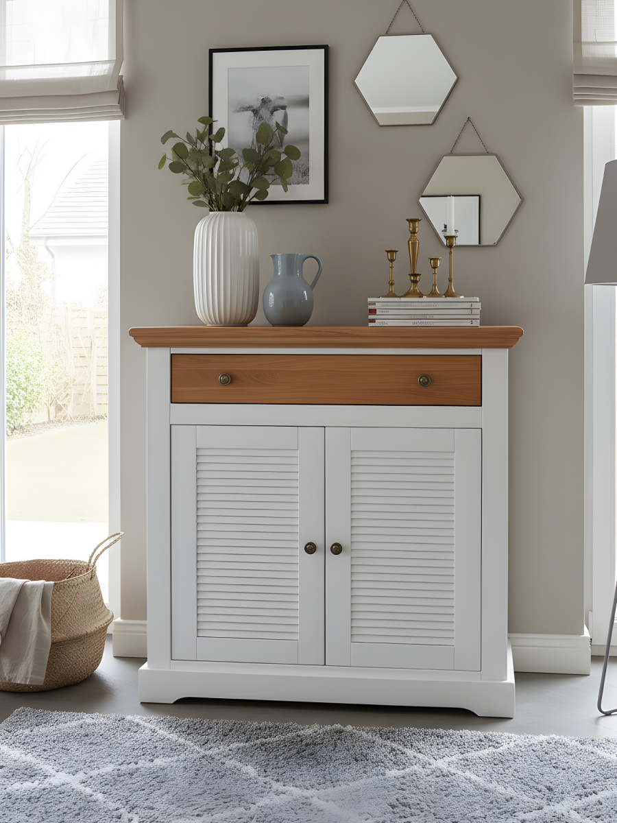 Уникальные особенности: высококачественные фасады из дуба, стильные фрезеровки и классический дизайн делают этот белый комод отличным выбором для любого интерьера. Возможность перестановки полок позволяет адаптировать внутреннее пространство под ваши нужды.