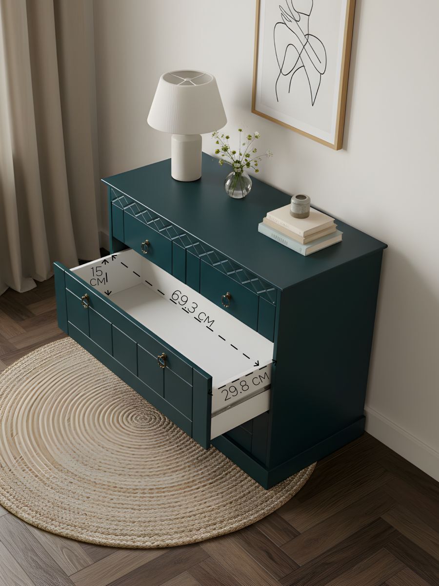 Элегантный комод в насыщенном изумрудном цвете для вашей прихожей или спальни. Классический дизайн с фрезеровками и ручками под состаренную латунь легко впишется в интерьер.