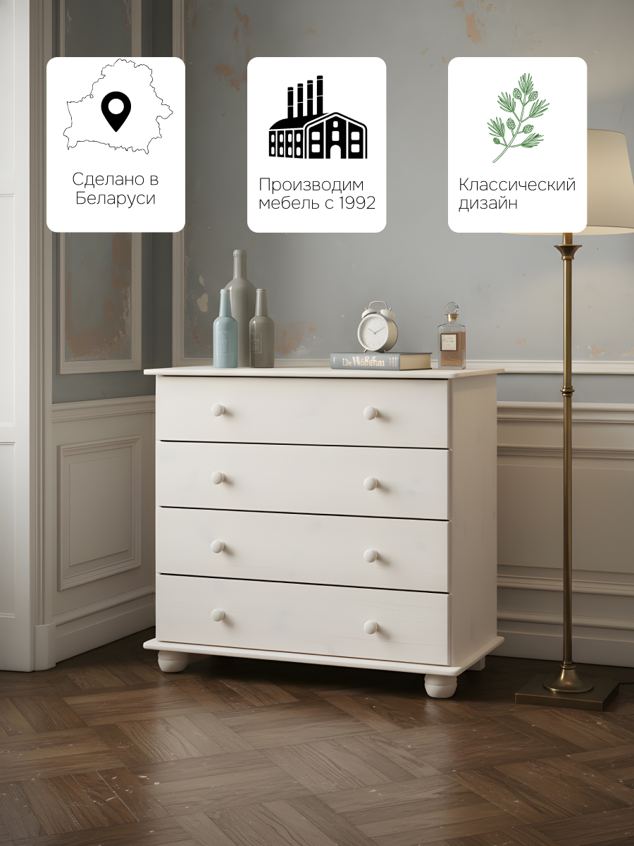 Комод от белорусского производителя "Dipriz" изготовлена из массива сосны с использование только экологически чистых отделочных материалов. Натуральный цвет дерева создаст уют в вашей гостиной, спальне или столовой. В ящики удобно складывать домашний текстиль и небольшие предметы.