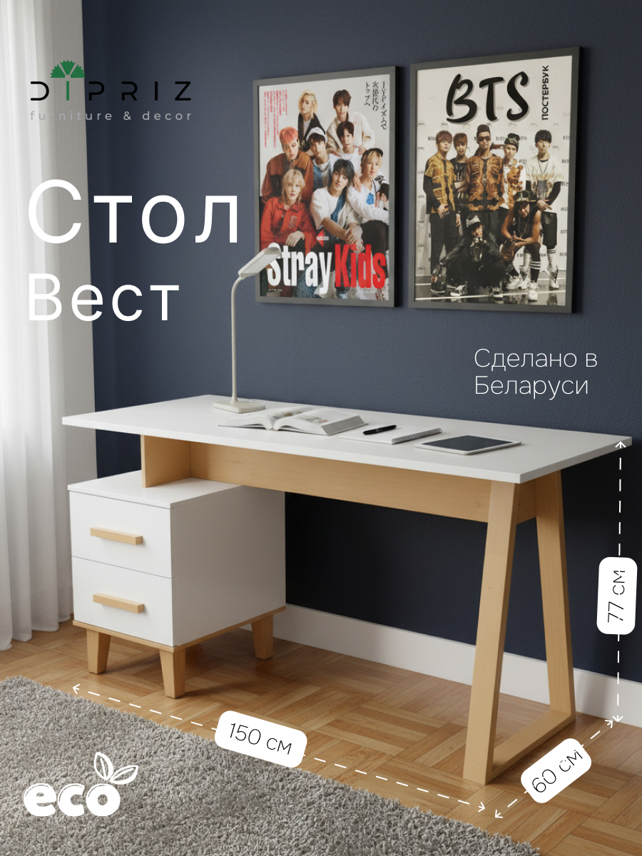 Стол компьютерный Вест 150х60х77 см, белыйДля тех, кто ценит эстетику минимализмаПриведите в порядок свое рабочее пространство с помощью компьютерного стола Вест. Этот элегантный стол в минималистичном белом цвете идеально подходит для современных интерьеров, добавляя легкости и простоты благодаря своему дизайну и натуральным материалам.Натуральные материалы для долговечности и стиляСтол Вест изготовлен из ЛДСП белого цвета с деревянными ножками из массива сосны, придающими ему не только прочность, но и приятную натуральную текстуру. Прочная столешница толщиной 22 мм обеспечивает достаточно пространства для работы или игр. Основные элементы корпуса из массива сосны защищены натуральным лаком, сохраняя матовую поверхность и приятный тактильный опыт.Функциональность, соответствующая вашим требованиямКомпьютерный стол оснащен двумя выдвижными ящиками с элегантными ручками из массива дерева, способными выдерживать нагрузку до 5 кг каждый. Эти ящики идеально подходят для хранения документов, канцелярских принадлежностей или игровых аксессуаров, помогая вам организовать пространство и сделать его более удобным для работы. В ящиках использовались шариковые телескопические направляющие полного выдвижения BOYARD DB3501Zn/400.Стиль, соответствующий вашему интерьеруБлагодаря своему минималистичному дизайну стол Вест гармонично впишется в различные интерьерные стили, такие как лофт, хай-тек, минимализм или современный стиль. Его светлый внешний вид придаст вашему пространству свежесть и легкость.Идеальный выбор для дома или офисаЭтот стол идеально подходит для создания рабочего места как в домашних условиях, так и в офисе. Он не только функционален, но и эстетичен, что делает его превосходным выбором для тех, кто ценит комфорт и стиль в своем рабочем пространстве. Его можно использовать как офисный компьютерный стол, так и белый письменный стол с ящиками в стиле лофт.Компьютерный стол Вест 150х60х77 см представляет собой идеальное сочетание современного дизайна, натуральных материалов и функциональности. Он будет прекрасным дополнением к любому интерьеру, обеспечивая комфорт и удобство в вашей повседневной работе или играх. Выберите стол Вест и создайте пространство, которое отражает ваш стиль и предпочтения.Этот стол уже в наличии и готов стать неотъемлемой частью вашего уютного и современного интерьера.