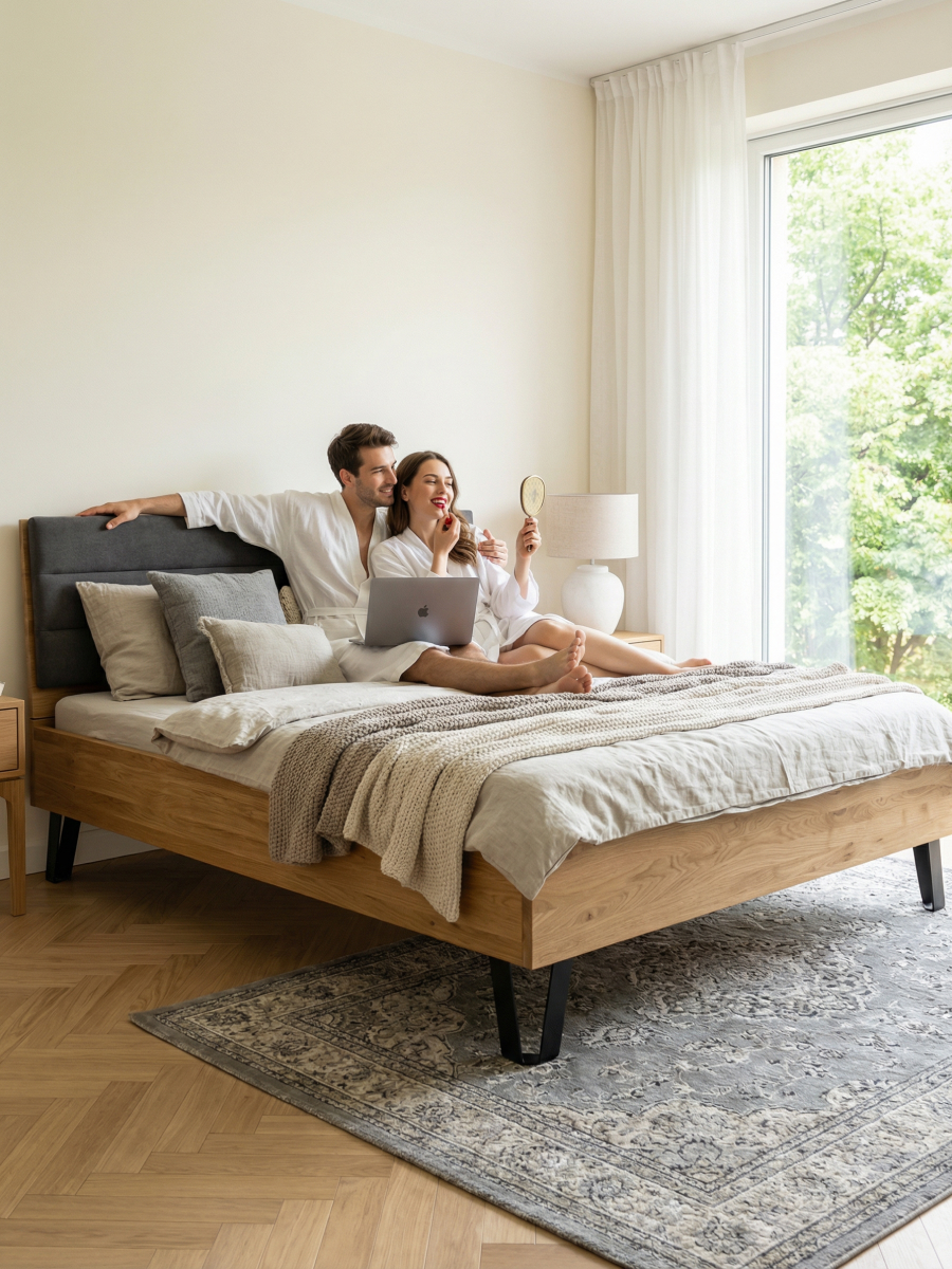 • Натуральный массив дуба: Каркас и изголовье изготовлены из прочного и долговечного массива дуба. Это гарантия надежности, экологичности и неповторимой текстуры каждого изделия. Дуб со временем только красивее.