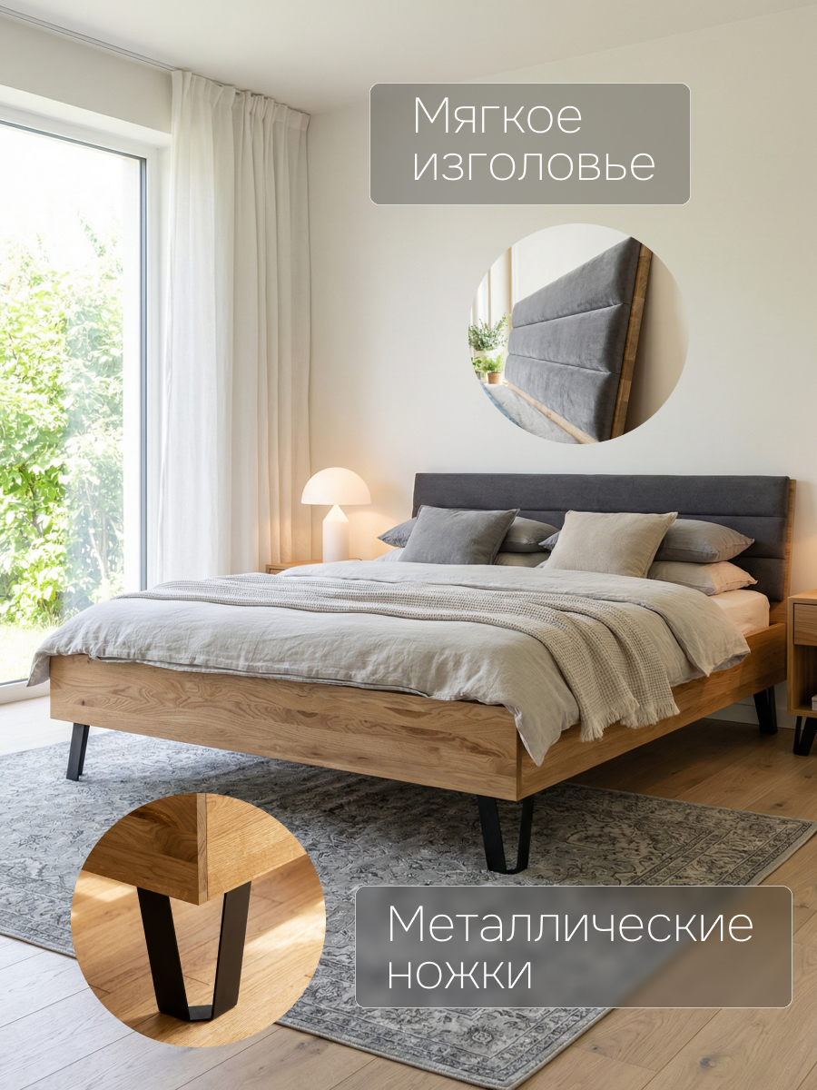• Натуральный массив дуба: Каркас и изголовье изготовлены из прочного и долговечного массива дуба. Это гарантия надежности, экологичности и неповторимой текстуры каждого изделия. Дуб со временем только красивее.