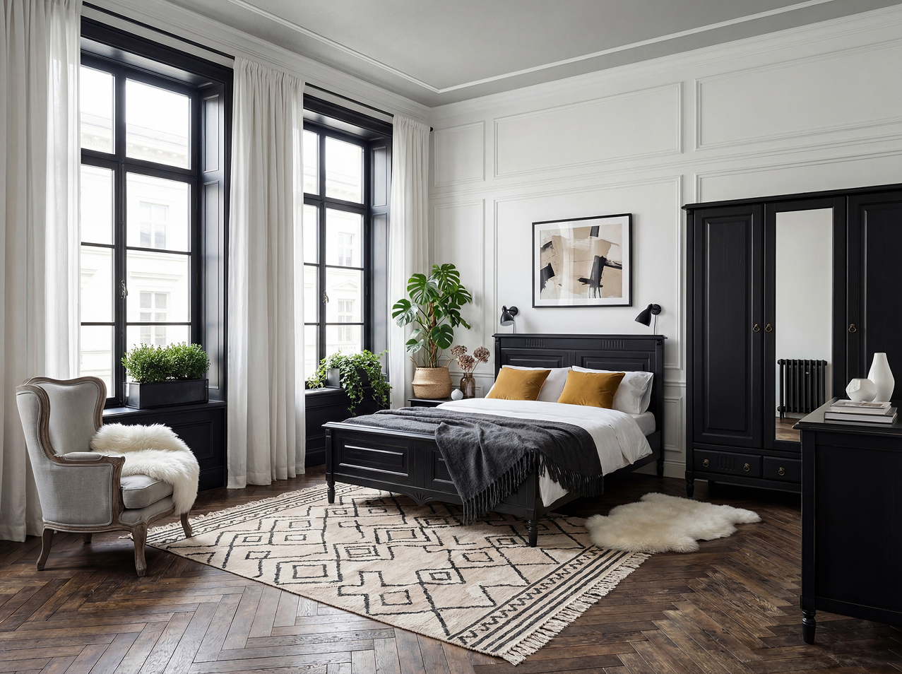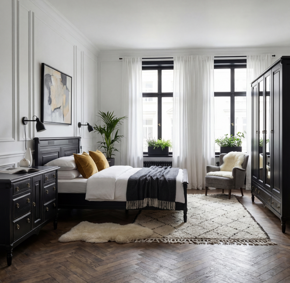 - Монохромный радикализм: полностью чёрная гамма создаёт ощущение «мебели-призрака» — она выглядит как антиквариат XVIII века, который 200 лет простоял в заброшенном шведском замке у торфяного камина. Это даёт невероятную глубину и драматизм пространству.