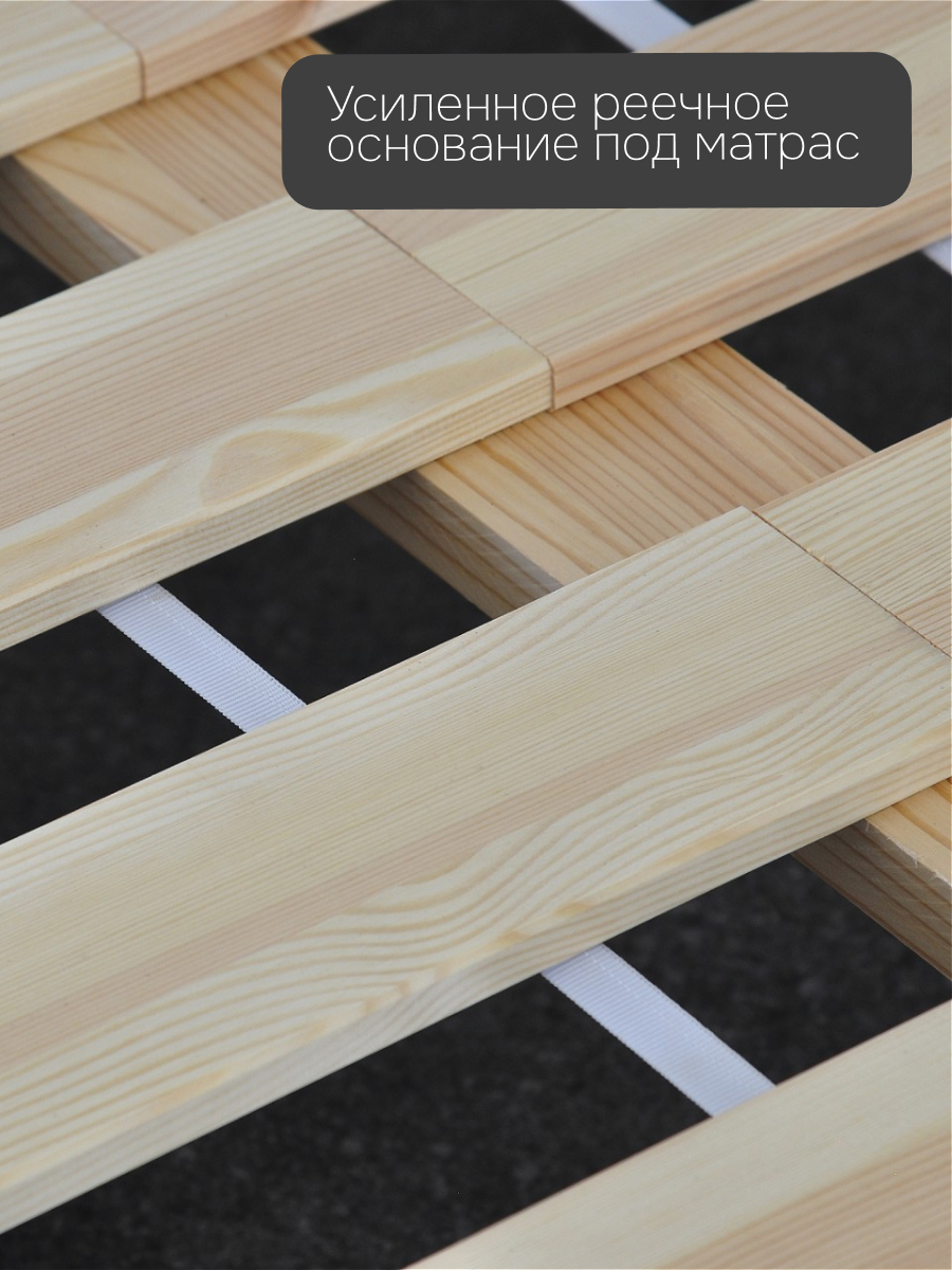 Массив березы — прочный и долговечный материал, идеальный для кровати на каждый день. Основание из натуральной сосны входит в комплект, поэтому вам не нужно отдельно подбирать решетку под матрас. Гипоаллергенный лак сохраняет естественную тактильную фактуру дерева и безопасен для всей семьи, в том числе для детей и людей с чувствительной кожей.