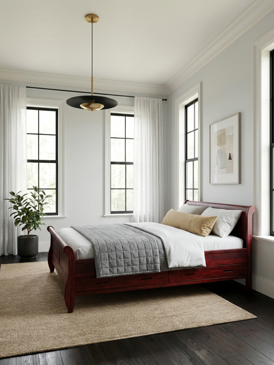 Выполненная в классическом стиле "сани" (sleigh bed), она очаровывает плавными, закругленными линиями изголовья и изножья, напоминающими изящные очертания старинных саней. Этот традиционный дизайн сочетает в себе утонченную элегантность французского провинциального стиля с современной функциональностью, идеально вписываясь в интерьеры от классики до минимализма. Красный цвет, нанесенный экологичными красками, подчеркивает натуральную текстуру дерева, создавая ощущение глубины и роскоши, которое так манит прикоснуться.