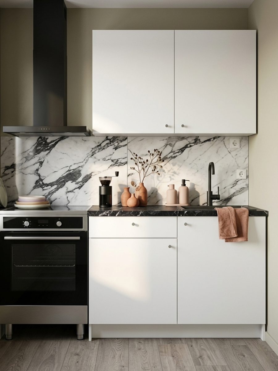 Единый стиль для вашей кухни: Белоснежные фасады с чистыми линиями — это классика, которая не выходит из моды. Такой тандем визуально облегчает пространство, наполняет его светом и воздухом. Строгая геометрия двух модулей одинаковой ширины создает эффект цельной, архитектурной композиции. Ансамбль одинаково гармонично смотрится как в компактной малогабаритной кухне, так и в просторной студии, служа идеальным фоном для ваших дизайнерских решений.