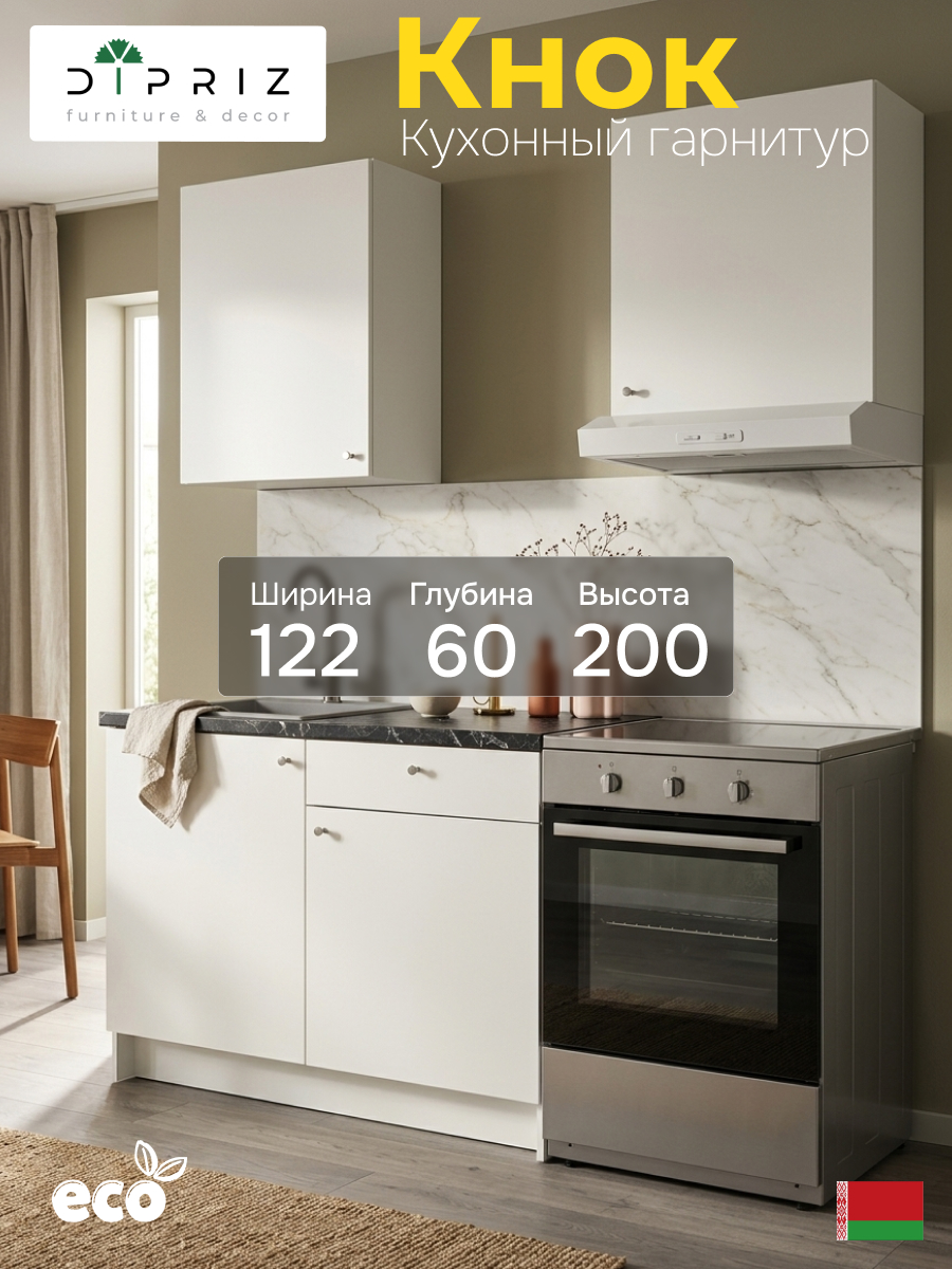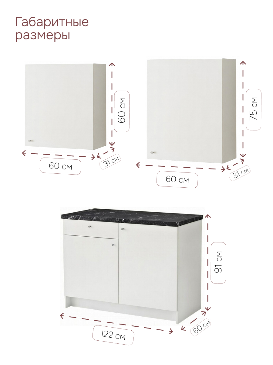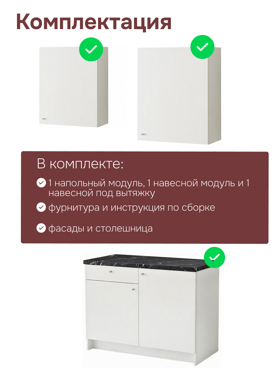 Гибкость планировки: Вы получаете готовый функциональный блок, который легко вписать в любую планировку. Все модули оснащены регулируемыми петлями: вы можете настроить направление открывания дверей (вправо или влево) в зависимости от расположения гарнитура. Модуль под вытяжку размещается над варочной поверхностью, а стандартный навесной шкаф — на ваше усмотрение, создавая удобную рабочую зону. Устойчивая напольная тумба станет надежным основанием для столешницы.