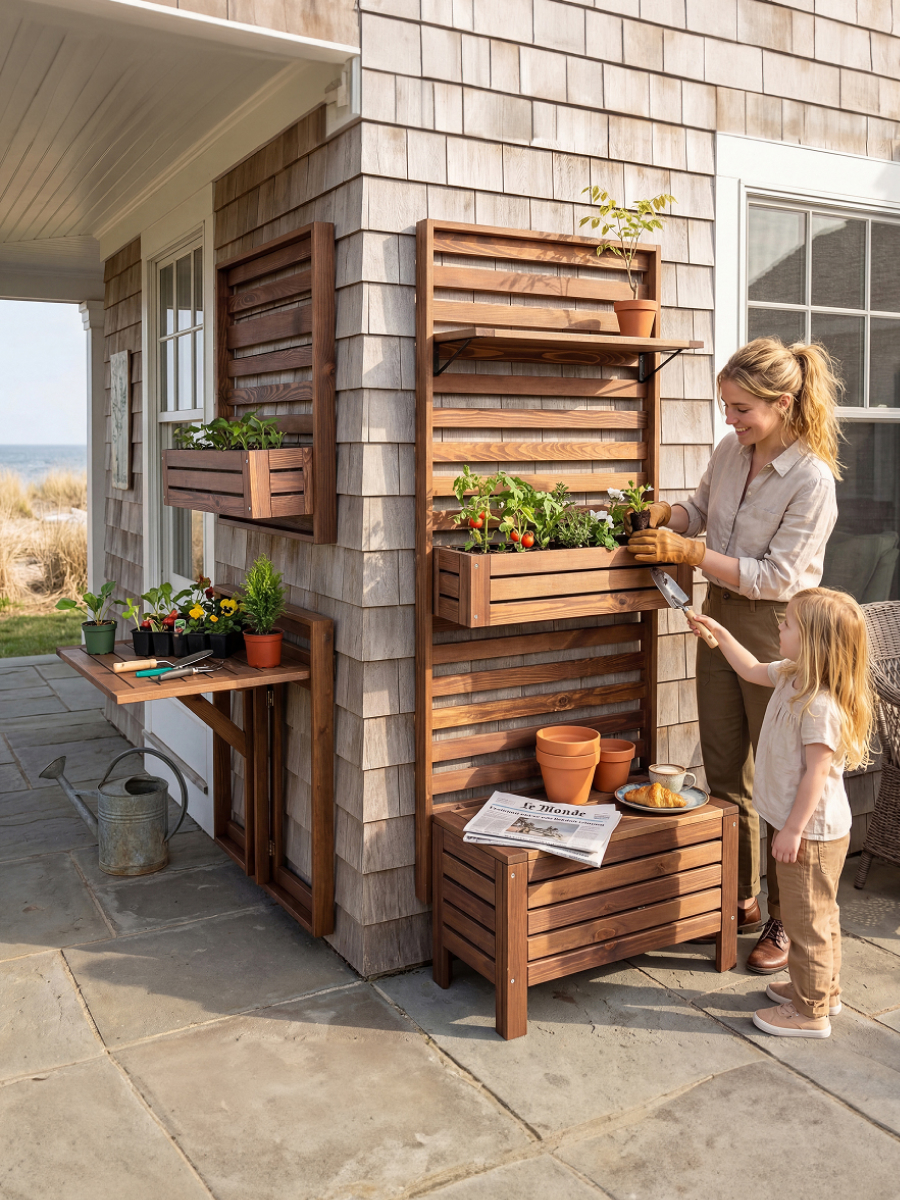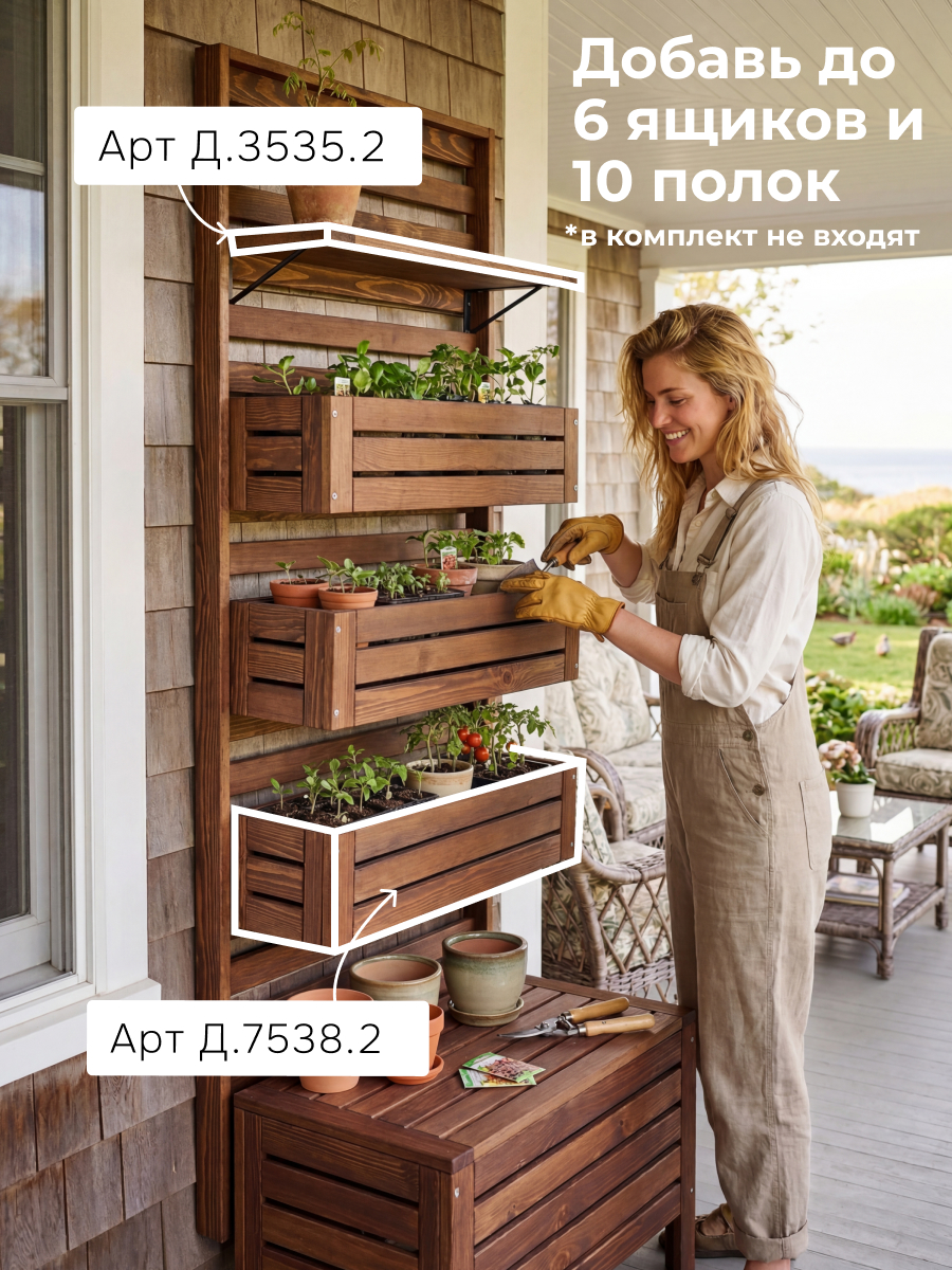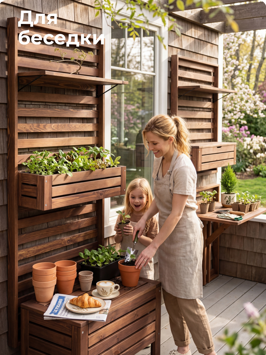 Серия садовой мебели Эпларо из массива сосны представляет собой уникальную модульную систему для оформления сада, балкона, лоджий и прихожих. Включая в себя разнообразные элементы, такие как сундук-скамья для удобного хранения вещей, декоративные панели, полки, навесные ящики, стол-трансформер и комплект металлических крючков, серия позволяет креативно комбинировать элементы и создавать уникальные композиции.