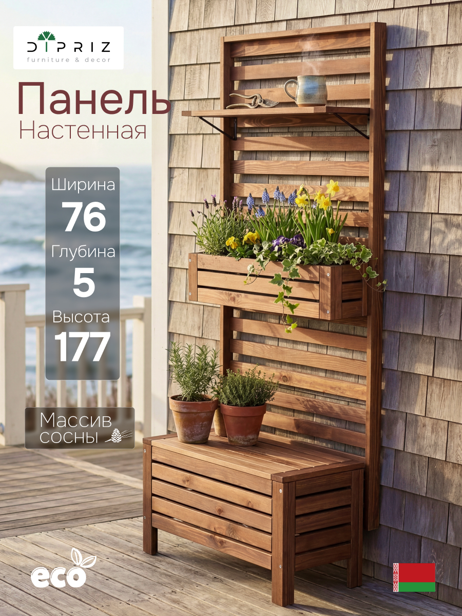 Навесная панель Эпларо - стильное дополнение к модульной садовой мебели, изготовленное из массива сосны и легко крепящееся к стене с помощью в комплекте идущей фурнитуры. Уникальность этой панели заключается в том, что вы сами определяете, какие элементы серии разместить на ней, делая ее настоящим организатором пространства.