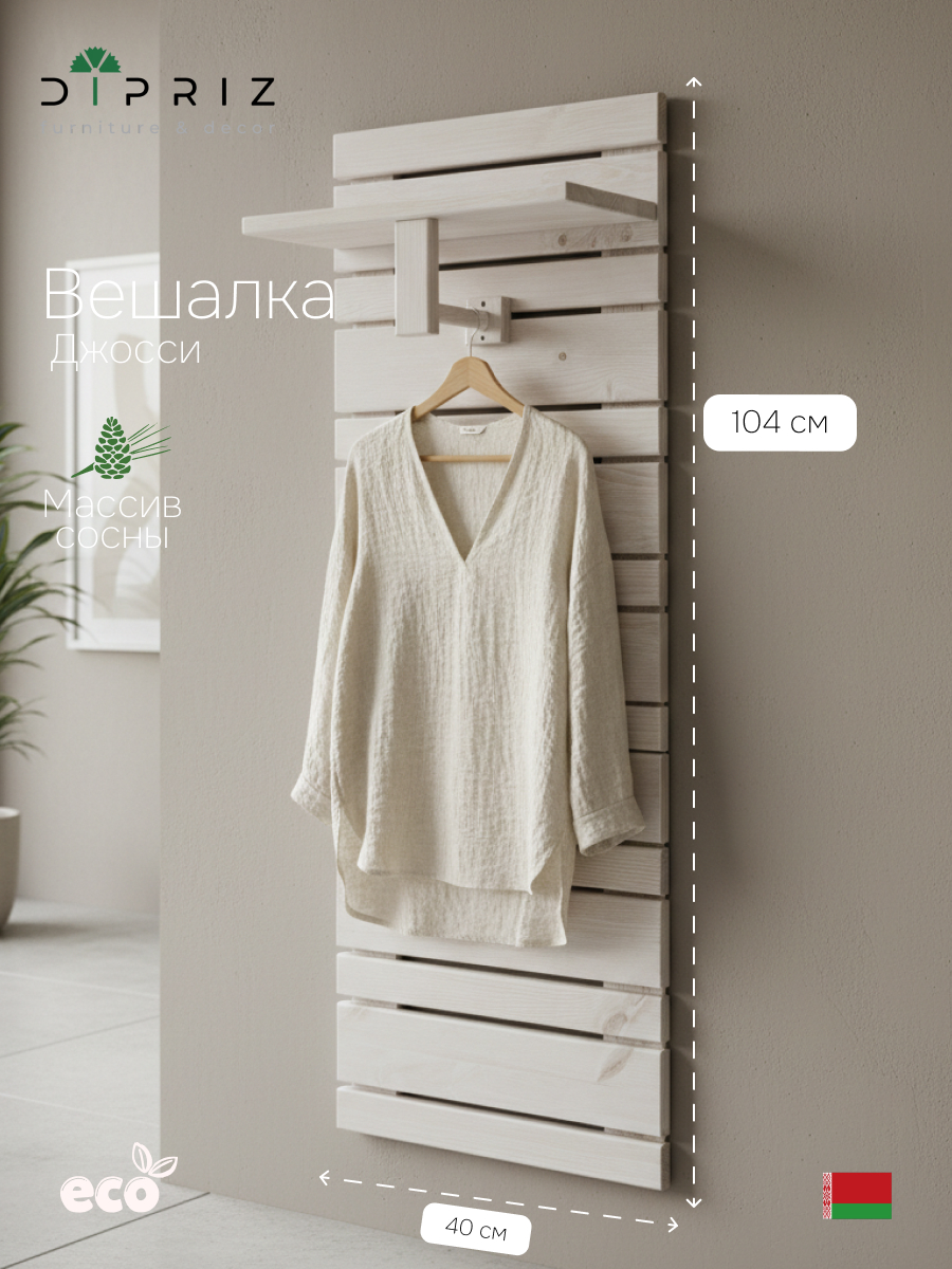 Вешалка деревянная настенная Джосси освободит пространство в Вашем доме, а также поможет поддерживать идеальный порядок в комнате. Вешалка открытая для одежды из массива сосны станет отличным подарком на любой праздник. Вешалка в прихожую идеально подойдет для любой верхней одежды. Полка навесная - отличное решение как для дома, дачи, так и для офиса. Вешалка с полкой на стену подходит для прихожих разных габаритов и располагается по плоскости стены. Настенная вешалка гардеробная из дерева надежно крепится на стену, собрать ее легко, инструкция по сборке прилагается. Вешалка изготовлена из натурального дерева сосны от белорусского производителя мебели "Диприз".