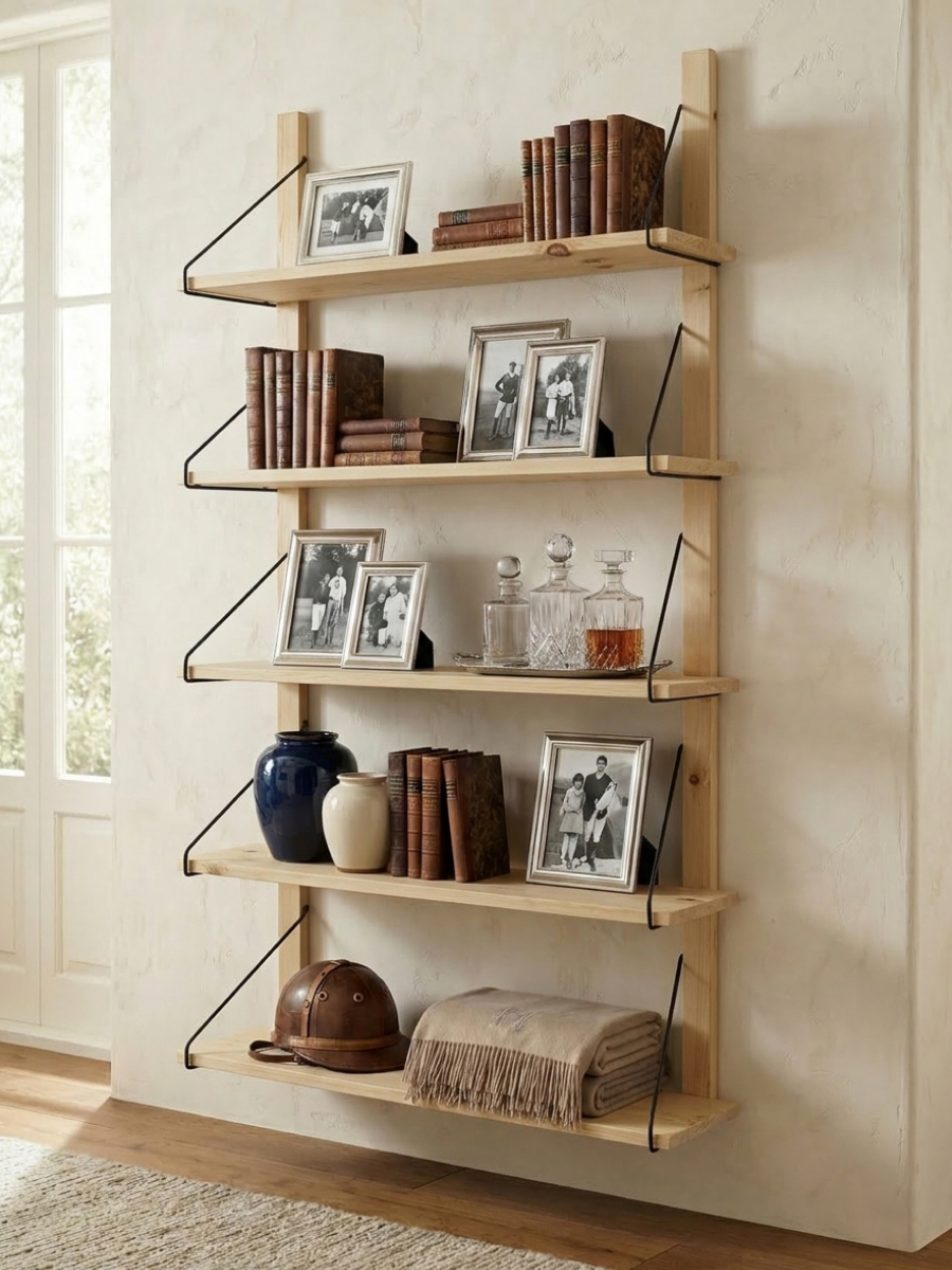 Лёгкая конструкция — стеллаж визуально парит, не давит и делает интерьер современнее без ремонта.