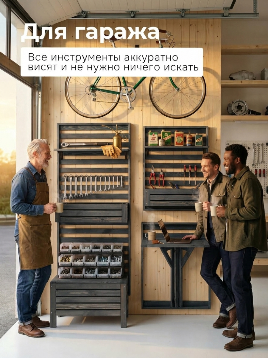 Серия садовой мебели Эпларо из массива сосны представляет собой уникальную модульную систему для оформления сада, балкона, лоджий и прихожих. Включая в себя разнообразные элементы, такие как сундук-скамья для удобного хранения вещей, декоративные панели, полки, навесные ящики, стол-трансформер и комплект металлических крючков, серия позволяет креативно комбинировать элементы и создавать уникальные композиции.