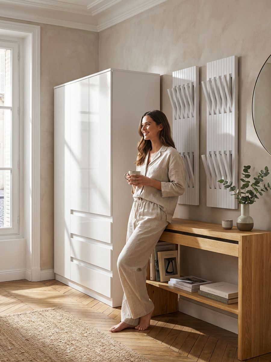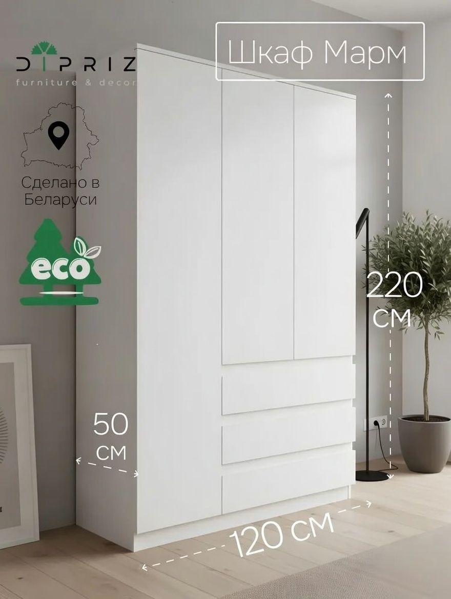 Шкаф для одежды Марм от белорусского производителя Dipriz - отличное дополнение скандинавского интерьера. Трехдверный распашной шкаф с 3 ящиками создаст порядок в любой комнате, будь то прихожая, спальня, гостиная, ванная или детская комната.