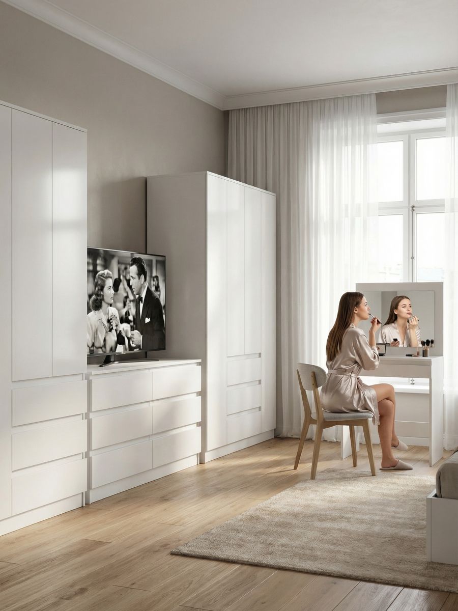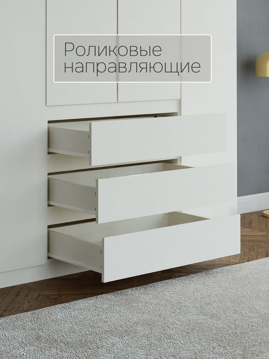 Конструкция шкафа включает в себя 3 съемные и 2 стационарные полки, 3 выдвижных ящика (шариковые направляющие), металлическую штангу для одежды и 3 распашные двери со скрытыми ручками. Внутреннее пространство белого шкафа можно использовать для хранения вещей одного типа или тематически по назначению. Например, верхние полки использовать под футболки и майки, нижние полки и ящики - под носки, перчатки и шарфы, пижамы и домашнюю одежду. Благодаря шариковым направляющим в комплекте, ящики шкафа будут плавно выдвигаться и тихо закрываться, они более надежны и долговечны.