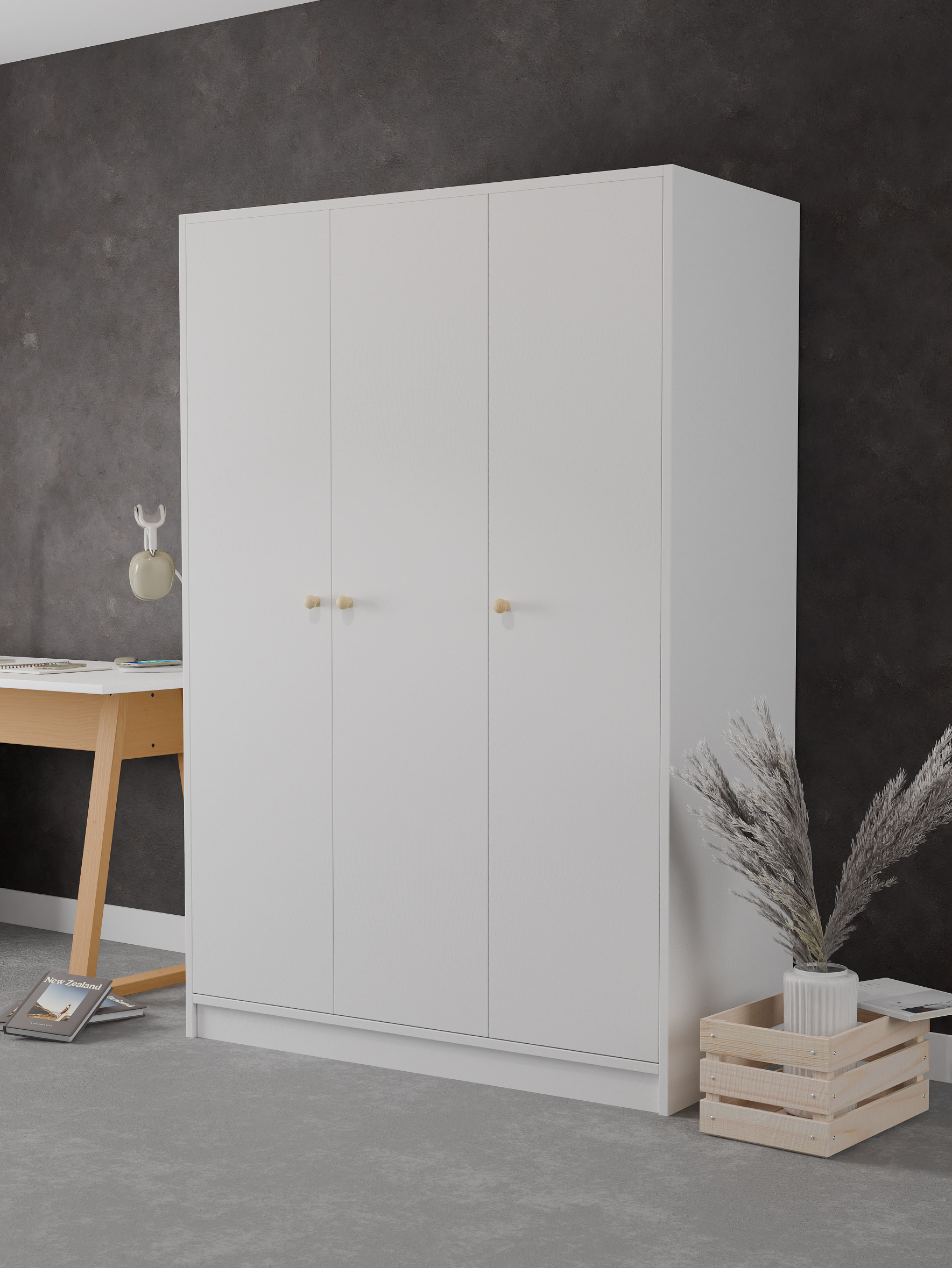 Распашной белый шкаф для одежды Марм 117х55х175 см – отличное дополнение скандинавского интерьера. Трехдверный шкаф со штангой и вместительными полками создаст порядок в любой комнате, будь то прихожая, спальня, гостиная, ванная или детская комната.