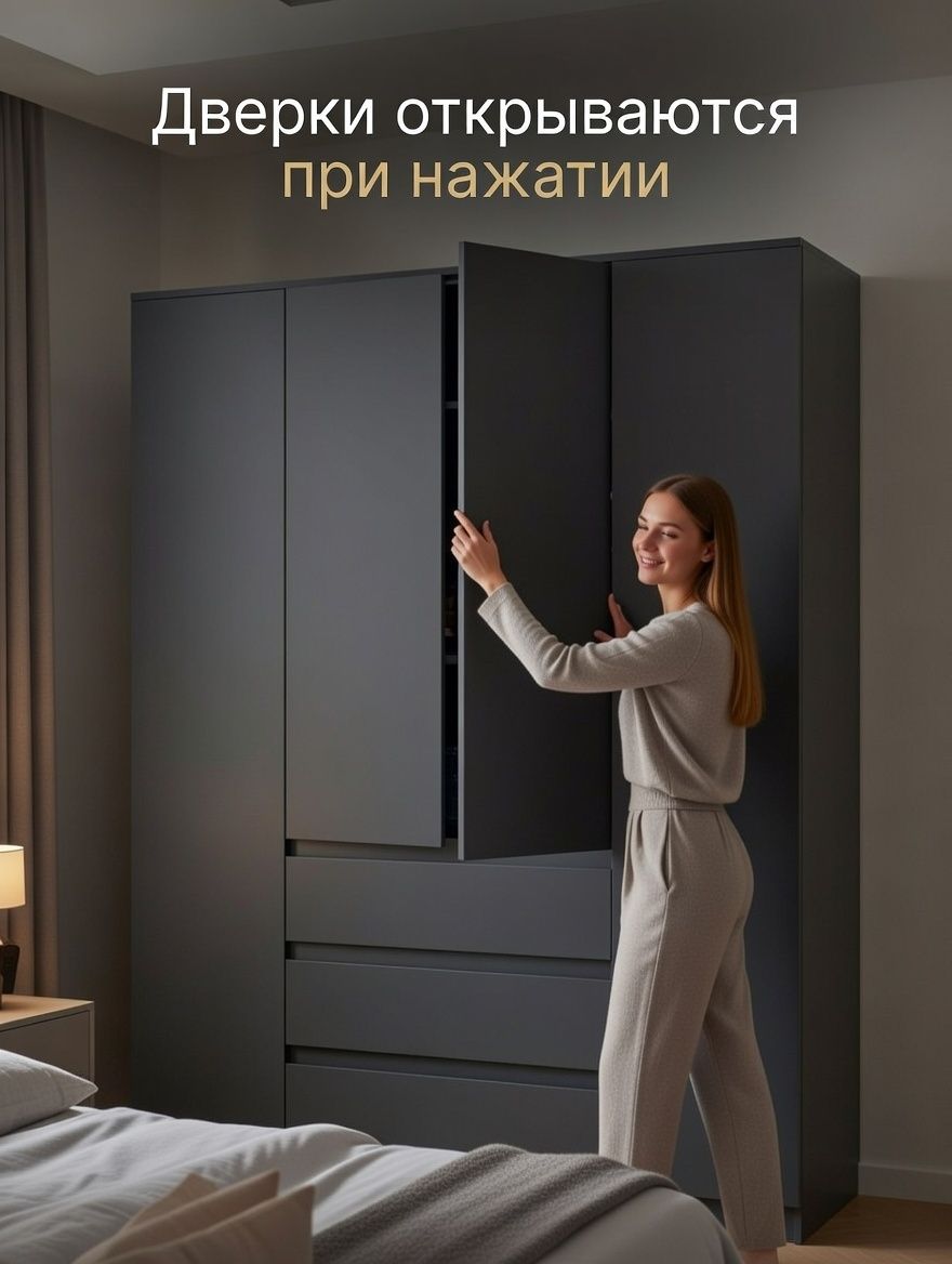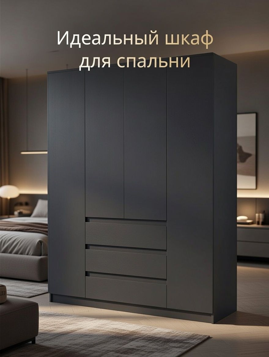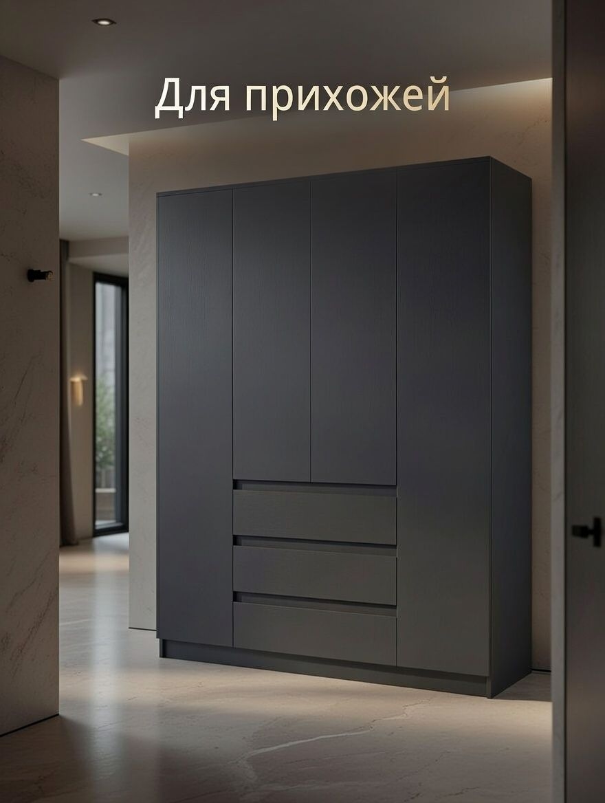 Шкаф распашной серии «Марм» от Dipriz сочетает практичность и современный дизайн. Его компактные размеры (160x50x220 см) обеспечивают вместительность для хранения одежды, аксессуаров и других предметов. Четыре двери с доводчиками и стопорами, три ящика с фиксаторами, регулируемые полки и встроенная штанга позволяют организовать пространство максимально эффективно.