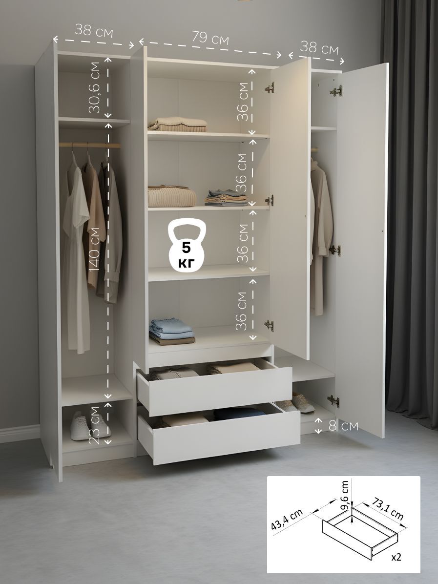 Конструкция шкафа включает в себя 8 полок, 2 выдвижных ящика (роликовые направляющие), деревянные штанги для одежды и 4 распашные двери со скрытыми ручками. Внутреннее пространство белого шкафа можно использовать для хранения вещей одного типа или тематически по назначению. Например, верхние полки использовать под футболки и майки, нижние полки и ящики - под носки, перчатки и шарфы, пижамы и домашнюю одежду. Благодаря роликовым направляющим в комплекте, ящики шкафа будут плавно выдвигаться и тихо закрываться, они более надежны и долговечны.