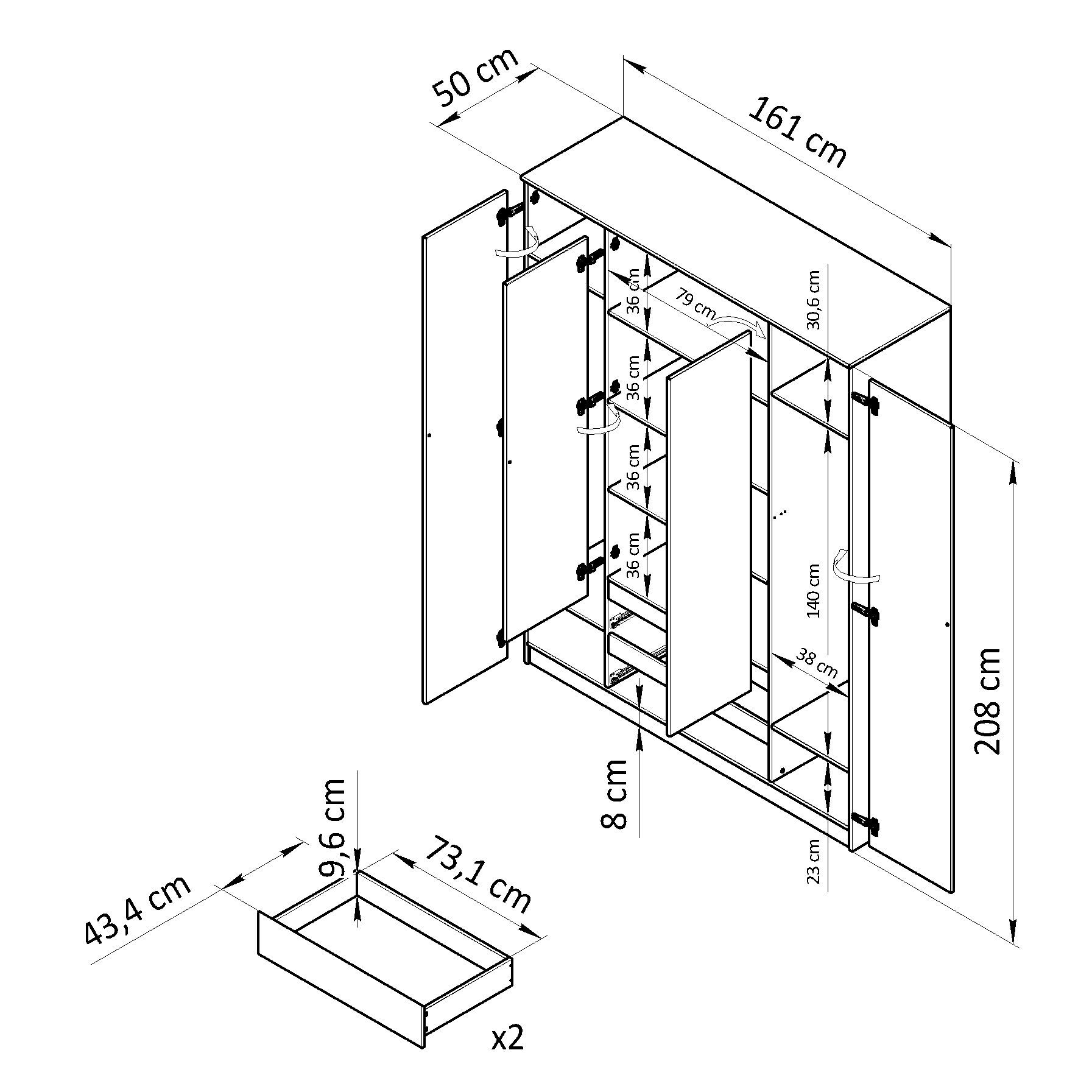 Размеры шкафа в собранном виде (Ширина х Высота х Глубина, см): 161х50х208 см, что позволит удобно хранить как домашнюю одежду и текстиль, так и верхнюю одежду с обувью, не беспокоясь о порядке. Особенностью изделия являются распашные двери и ящики без видимых ручек, которые открываются легким движением руки. Полки с регулировкой высоты позволят использовать внутренне пространство шкафа по Вашему желанию, а максимальная допустимая нагрузка на полку составляет 5 кг.