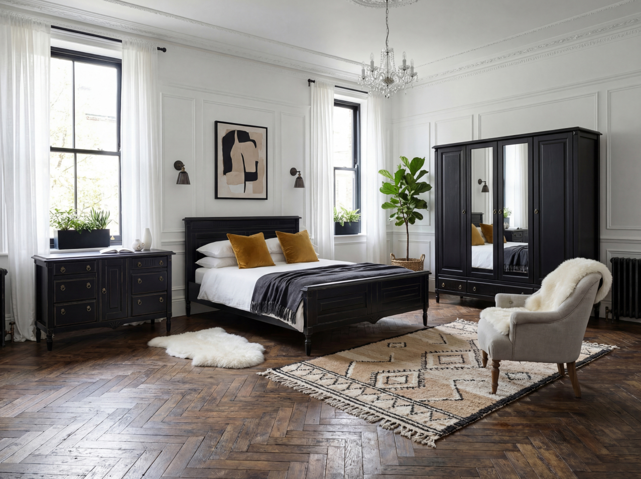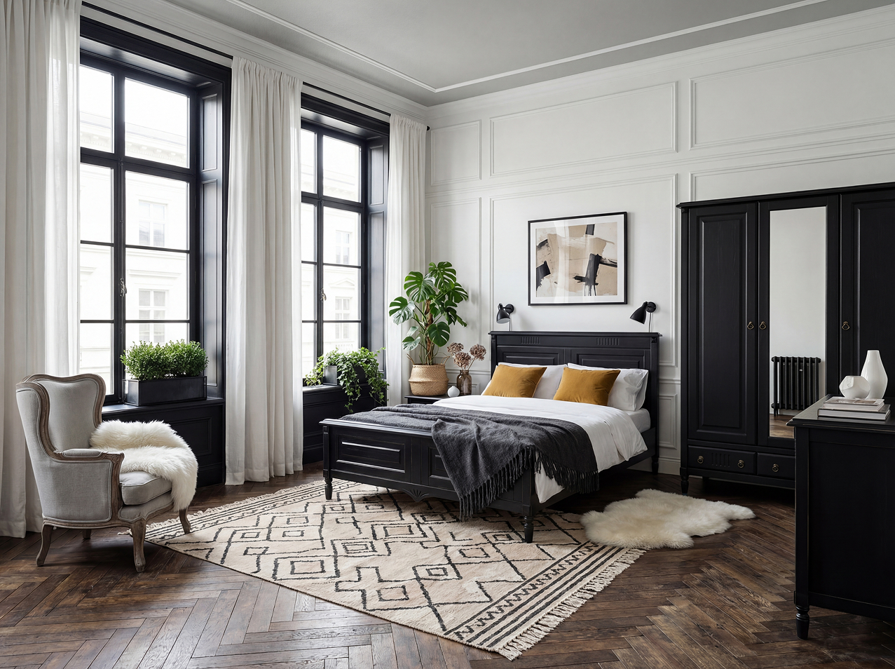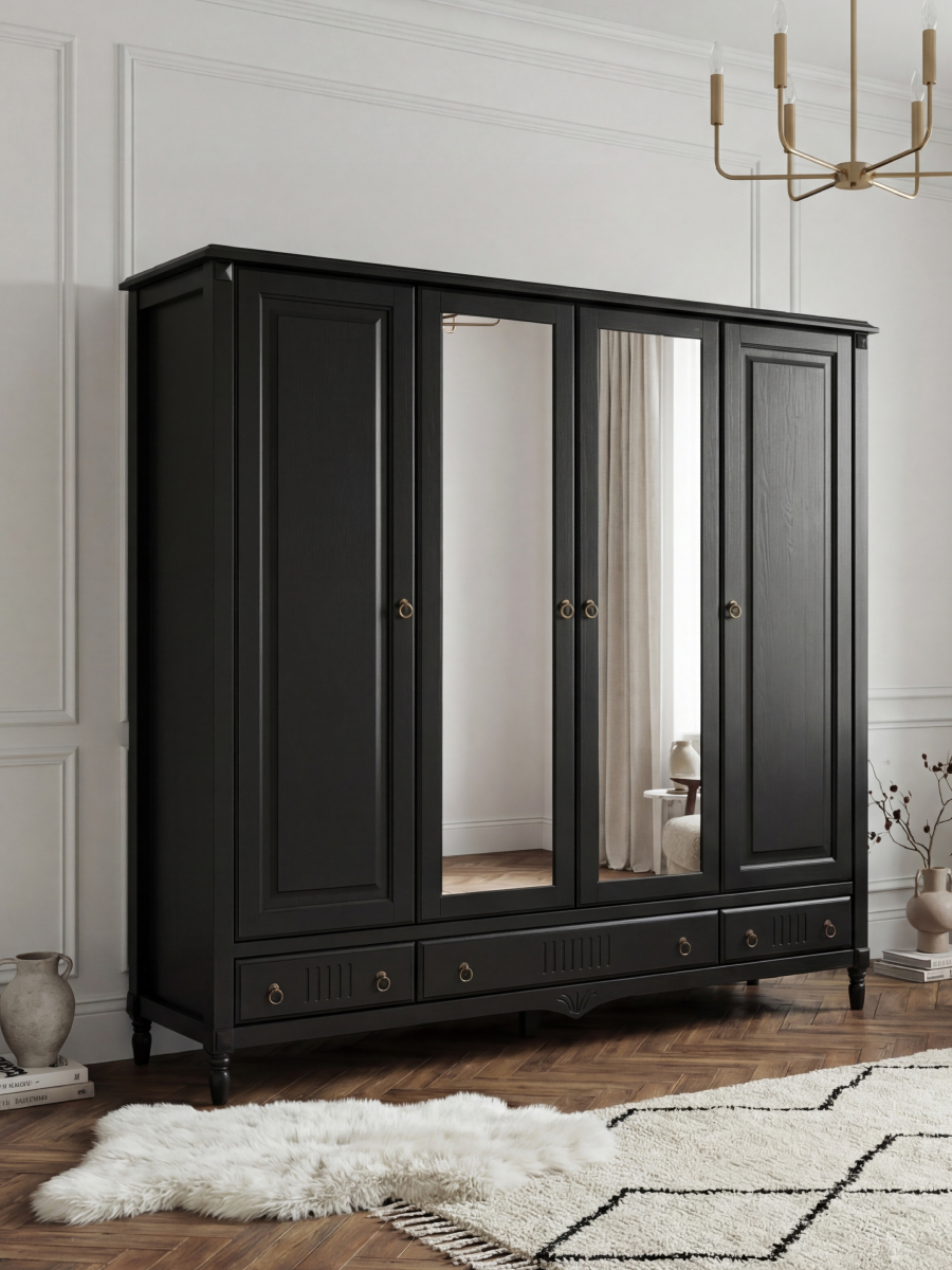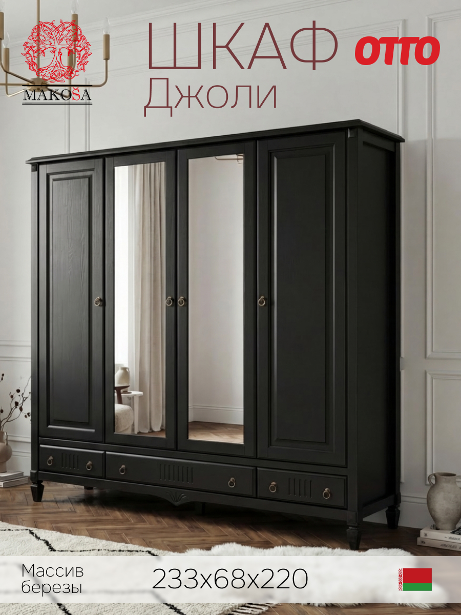 Элегантный четырехдверный шкаф выполнен из массива березы и дерева, что гарантирует долговечность и естественную красоту. Черный цвет фасада дополняет классический итальянский дизайн, идеально подходящий для спальни или гостиной.