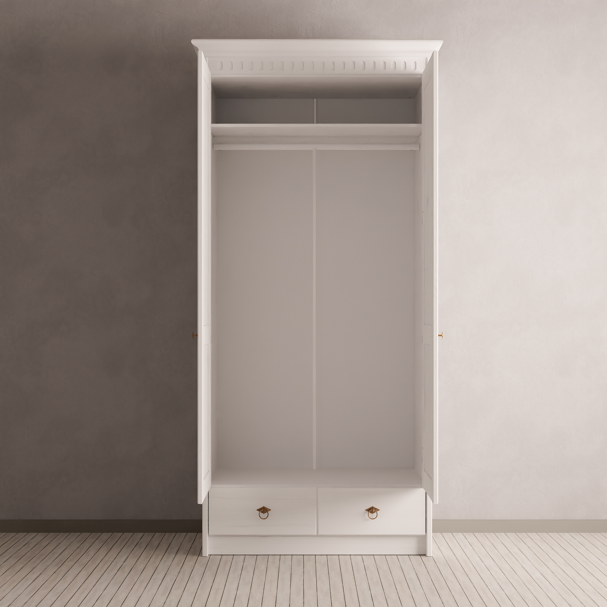 Двухдверный распашной шкаф от фабрики «Диприз» сочетает в себе универсальный классический дизайн, экологичность натурального дерева и белорусское качество. Идеально подходит для хранения одежды в спальне, текстиля в гостиной или вещей в прихожей.