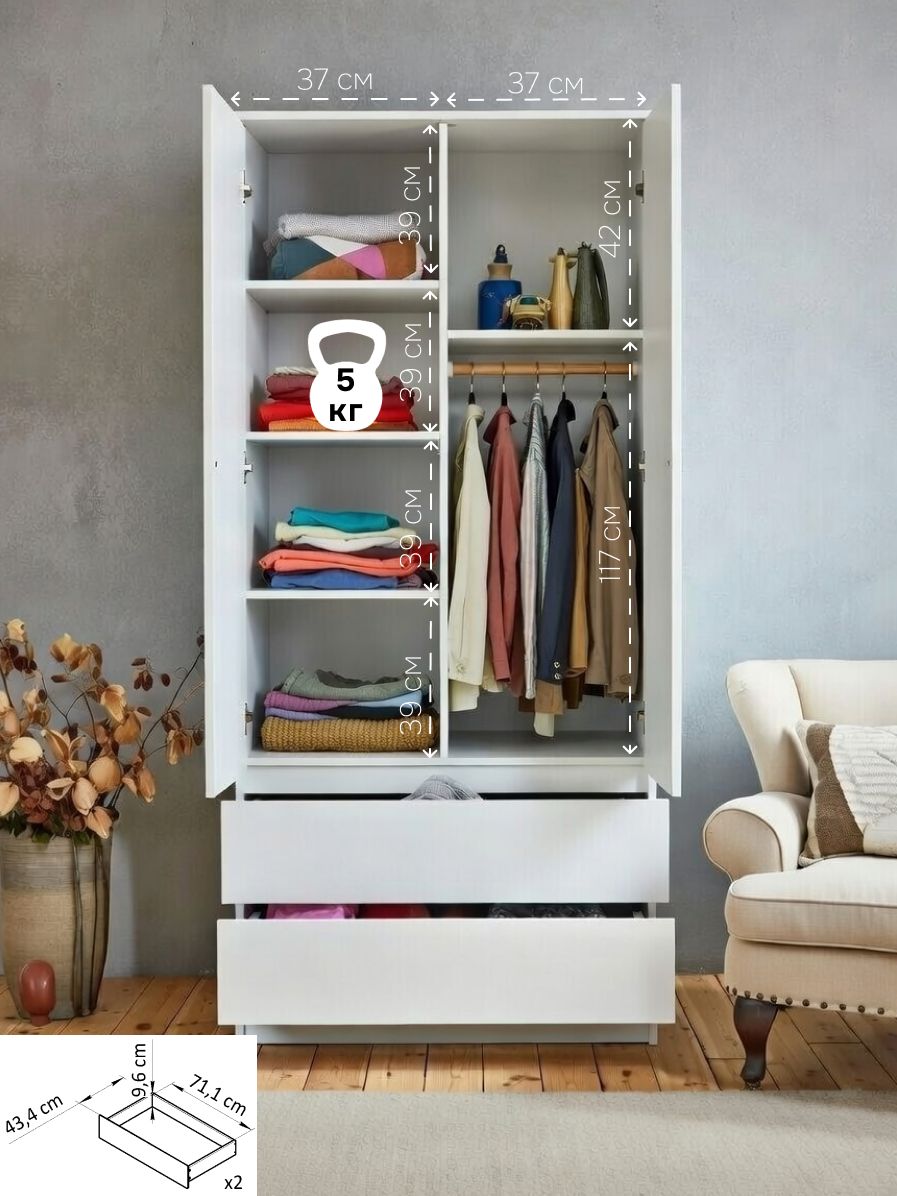 Шкаф для одежды Мальм от белорусского производителя Dipriz - отличное дополнение скандинавского интерьера. Двухдверный распашной шкаф с 2 ящиками создаст порядок в любой комнате, будь то прихожая, спальня, гостиная, ванная или детская комната.