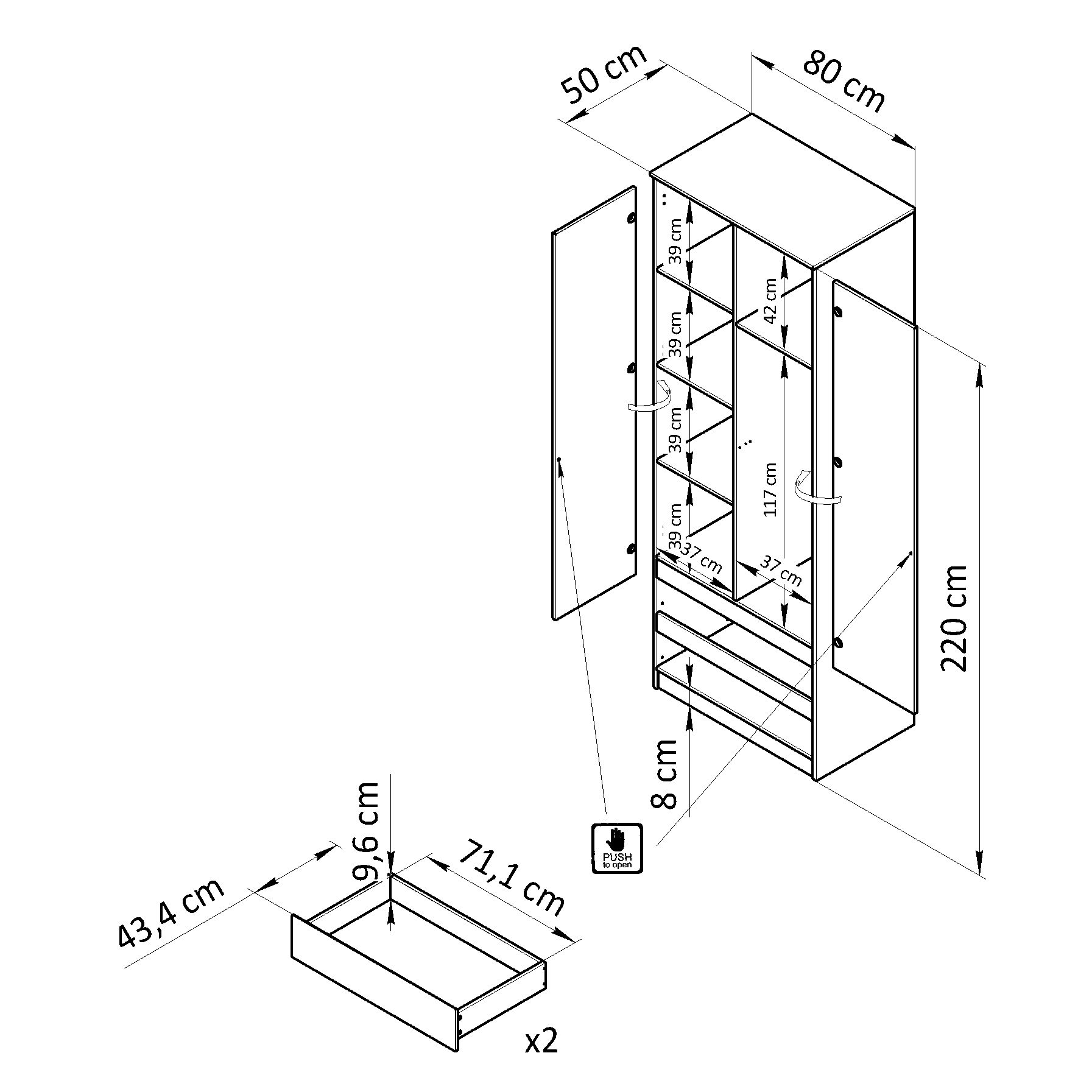 Размеры шкафа в собранном виде (Ширина х Высота х Глубина, см):80х220х50 см, что позволит удобно хранить как домашнюю одежду и текстиль, так и верхнюю одежду с обувью, не беспокоясь о порядке. Особенностью изделия являются 2 распашные двери без ручек, которые открываются легким нажатием на фасад благодаря установленному механизму. Полки с регулировкой высоты в 3 положениях позволят использовать внутренне пространство шкафа по Вашему желанию, а максимальная допустимая нагрузка на полку составляет 5 кг.