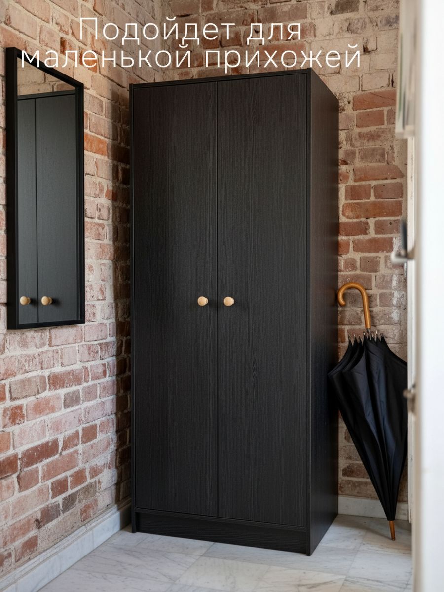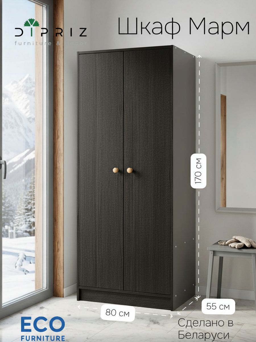 Шкаф для одежды Марм цвета черной сосны — это простой и надежный помощник, который поможет навести идеальный порядок в вашем доме. Представьте: открываете дверцы — и все вещи на своих местах, ничего не валяется, комната выглядит светлой и уютной. Двухдверный распашной шкаф с деревянной штангой из массива сосны и полкой от белорусского производителя Dipriz создан именно для этого — хранить одежду, обувь или игрушки так, чтобы было удобно и красиво.
