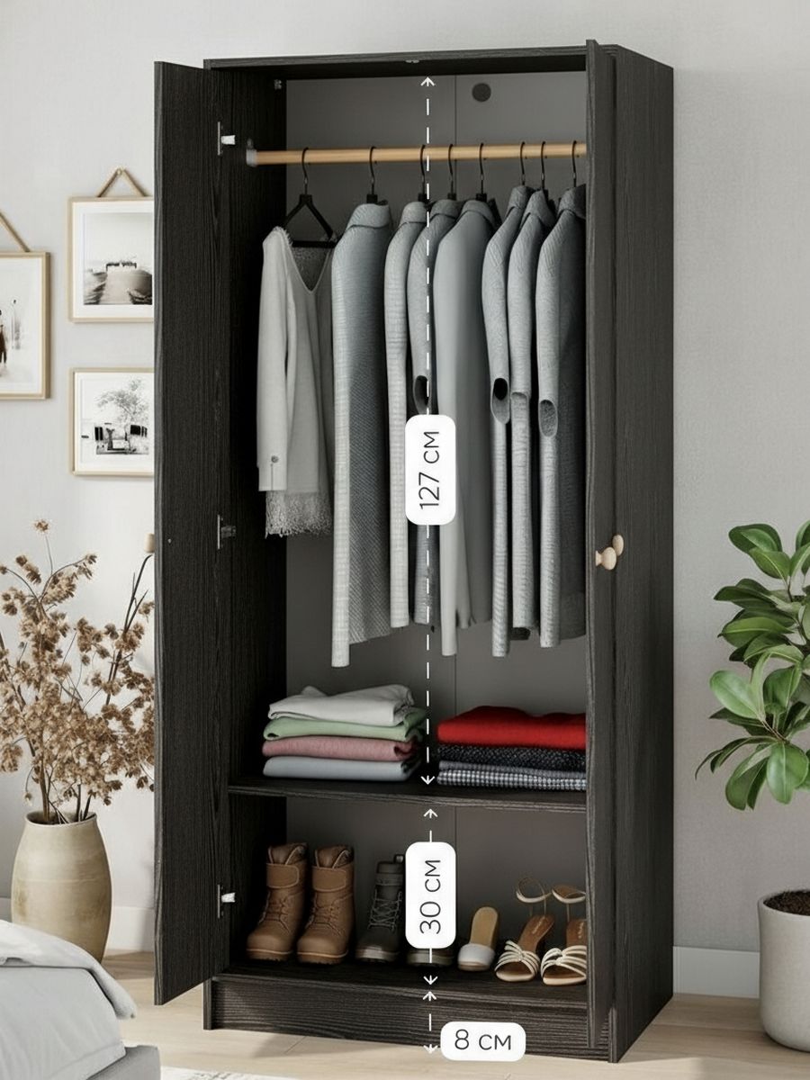 Две распашные двери с ручками из массива сосны (диаметр 34 мм) открываются плавно благодаря петлям с доводчиком и стопором — не хлопают, безопасно для детей. Внутри — регулируемая штанга в 5 положениях, чтобы настроить пространство под себя. Для устойчивости можно прикрепить шкаф к стене уголком (в комплекте). Максимум простора без лишнего!