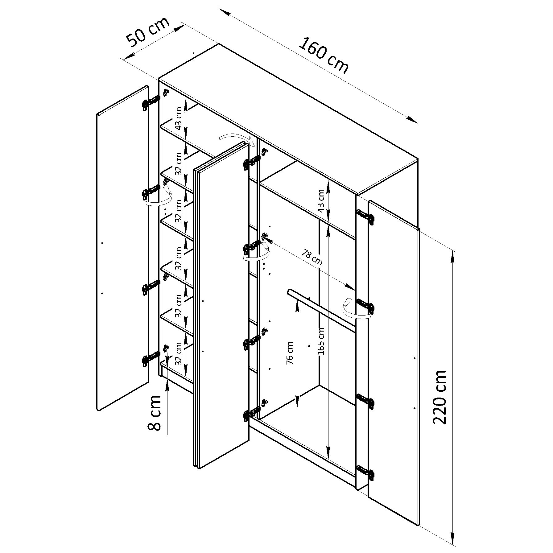 Просторный и вместительный: Большие габариты (ВхШхГ: ~208x161x50 см) позволяют разместить обширный гардероб.