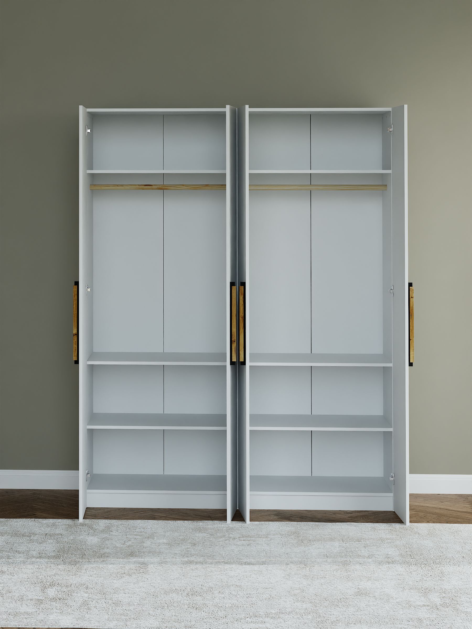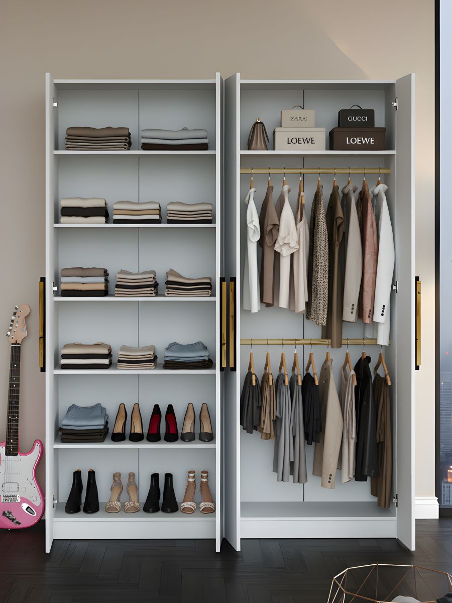 Индивидуальная конфигурация: Благодаря системе перестановки, вы можете менять расположение полок и штанг в разных отсеках, подстраивая шкаф под свои нужды.