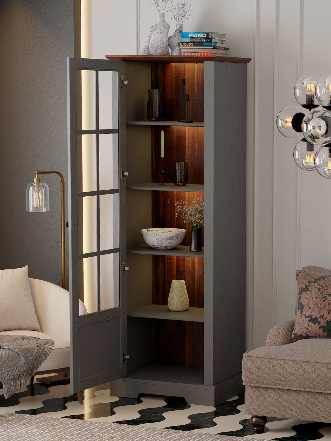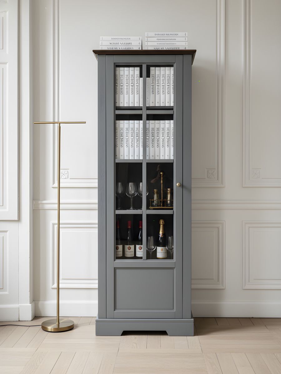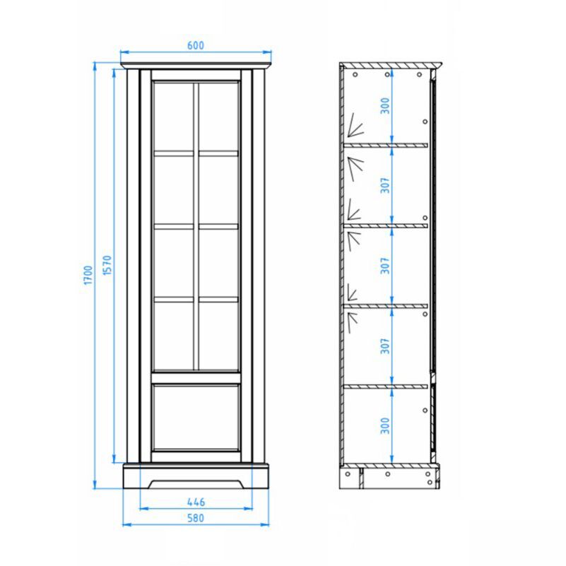 Шкаф витрина имеет распашную дверь, которая обеспечивает легкий доступ к содержимому, не занимая при этом много места. Эта стеклянная дверца защищает ваши вещи от пыли, оставаясь при этом прозрачной, чтобы ваши любимые предметы постоянно были на виду. Четыре съемные полки обеспечивают достаточно пространства для хранения вещей и посуды. Максимальная нагрузка составляет до 5 кг на полку.