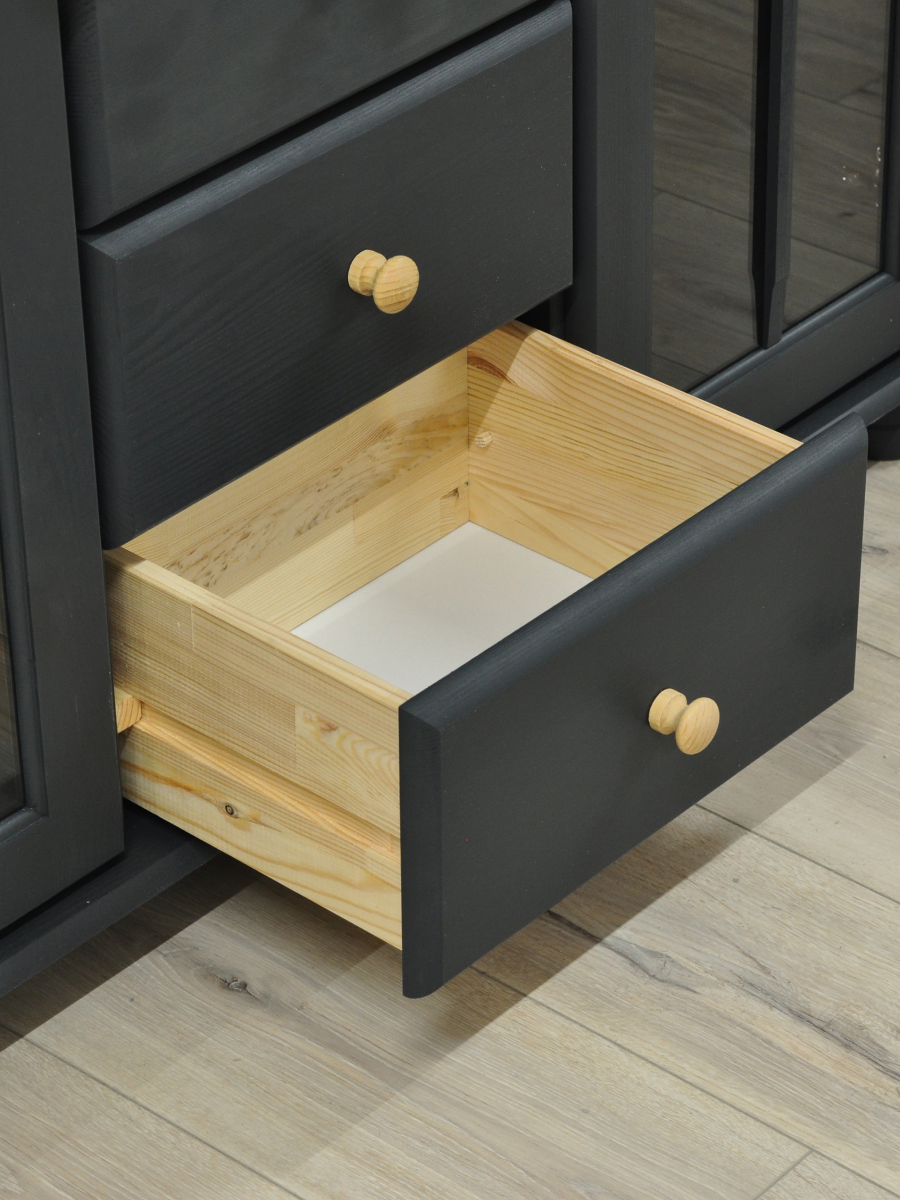 Покрытие серым воском с антикварным эффектом добавляет изделию уникальный внешний вид, подчеркивая текстуру древесины и сохраняя её натуральный оттенок. Такой воск защищает древесину от внешних воздействий, сохраняя её первоначальную свежесть на долгие годы. При этом, в отличие от химических покрытий, воск не выделяет вредных веществ, что делает комод безопасным и экологичным вариантом для дома.