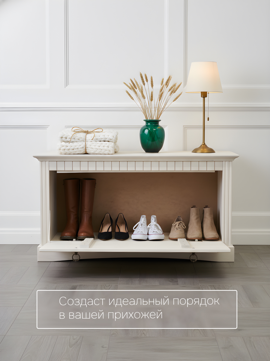 Банкетка обувница Неаполь станет незаменимым помощником в вашем доме, объединяя в себе функции хранения и комфортного использования. Скамья для обуви в прихожую идеально вписывается в различные стили интерьера, включая классический, современную классику, викторианский, минимализм и модерн. Изделие также прекрасно подойдет для создания уютного светлого помещения, его можно использовать как тумбу для обуви, комод для прихожей, банкетку, обувницу с сиденьем, обеспечивая функциональность и эстетику. Комбинируйте ее с другими элементами интерьера серии Сюзанна, создавая уютное и стильное пространство.