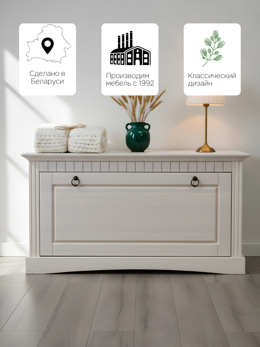 Выполненная из массива сосны, эта тумба для обуви не только предлагает удобное место для хранения обуви и других предметов, но и служит полноценным элементом интерьера прихожей. Благодаря белому цвету (за счет покрытия натуральным воском) обувница добавит элегантности и красоты Вашему помещению, сохранит приятный хвойный аромат и полезные свойства дерева. Это обеспечивает не только стойкость к внешним воздействиям, но и подчеркивает естественную красоту массива дерева. Фасад комода для обуви дополнен декоративными резными вставками, которые добавит изысканности в ваше помещение.