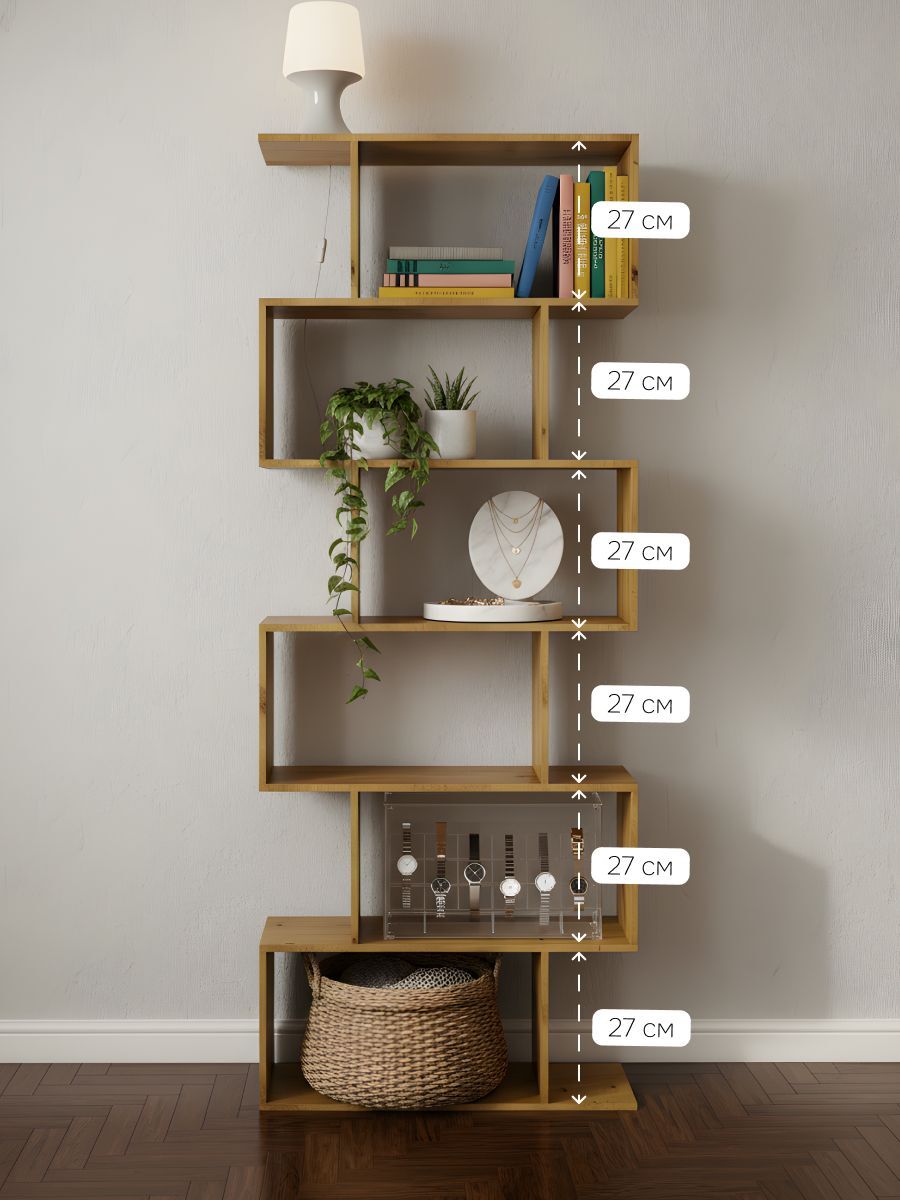 - Компактные размеры — высота 174 см, ширина 72 см, глубина 24 см, с расстоянием между полками 27 см.