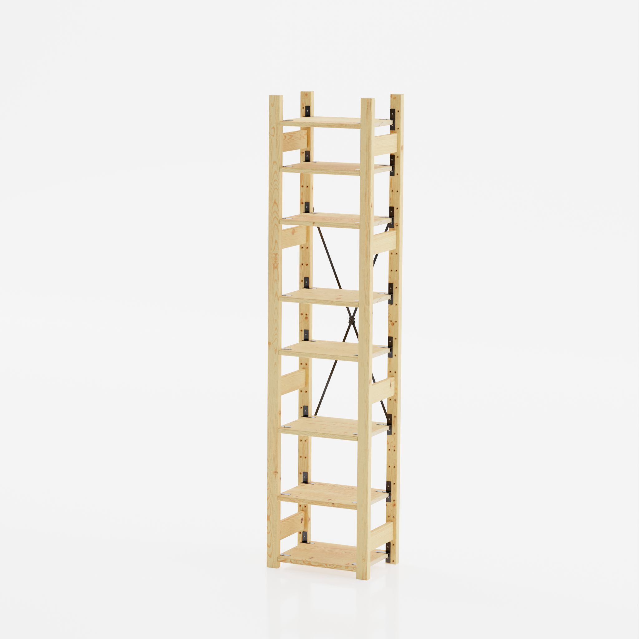 Этот узкий стеллаж представляет собой гармоничное сочетание натуральных материалов и функционального дизайна. Он оснащен 8 прочными полками, изготовленными из массива сосны размером 42х30 см, которые позволяют вам хранить разнообразные предметы – от книг и игрушек до растений и декоративных элементов. Каждая полка легко крепится на подходящей для Вас высоте за счет комплекта металлических кронштейнов.