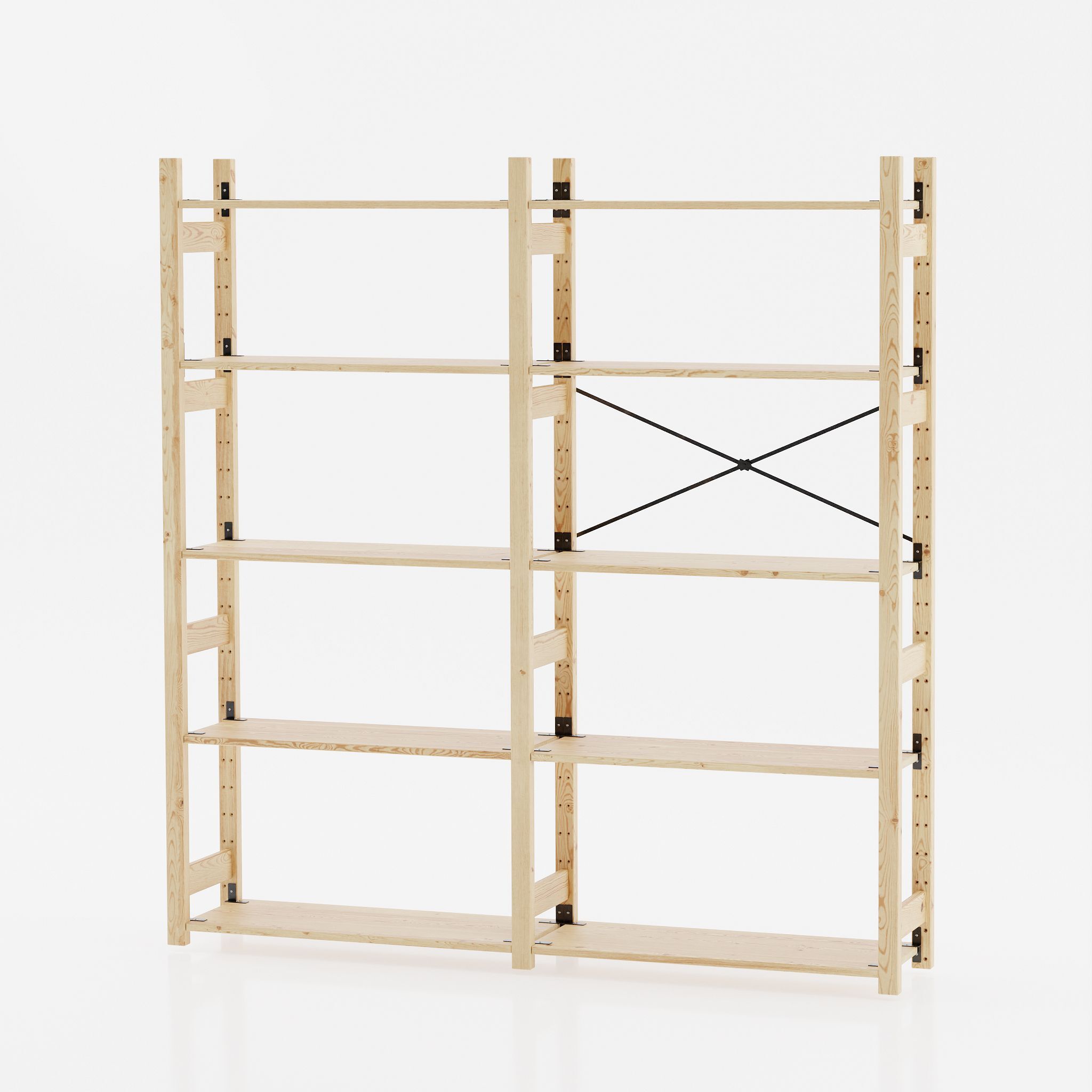 - Прочная конструкция: боковые стойки высотой 179 см и толщиной 45х45 мм обеспечивают надежность и долговечность. Конструкция стеллажа включает в себя 3 боковые стойки для стеллажа Ивар высотой 179 см, 10 полок для стеллажа Ивар размером 83х30 см, металлическую крестовину, 10 наборов металлических кронштейнов для установки полок, комплект фурнитуры. Все фаски были сглажены с целью предотвращения случайных ударов или зацепов.