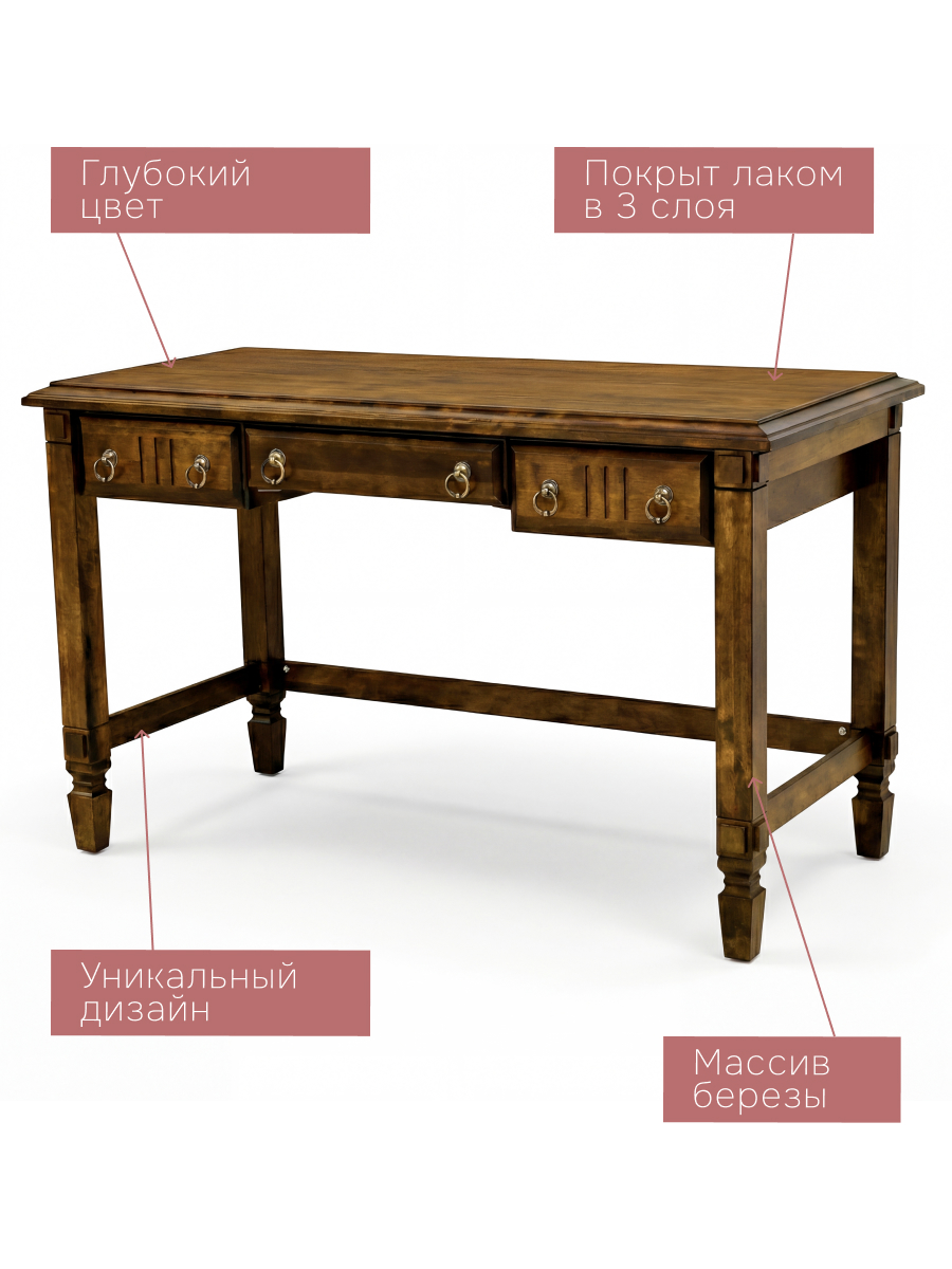 Создайте идеальные условия для работы или учебы благодаря этому многофункциональному компьютерному столу. Каркас и столешница выполнены из прочного массива берёзы с лаковым покрытием, обеспечивающим долговечность и эстетическую привлекательность. Три практичных ящика со скрытыми направляющими помогут аккуратно организовать рабочее место.