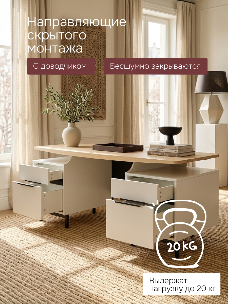 Стол Ochensol — это эстетика минимализма, где каждая деталь продумана до мелочей. Большое рабочее пространство, вместительные ящики и эффект парящей столешницы делают его идеальным выбором для дома и бизнеса.