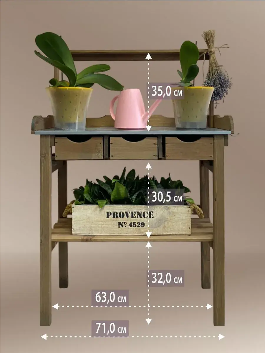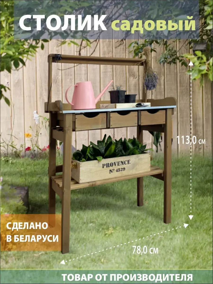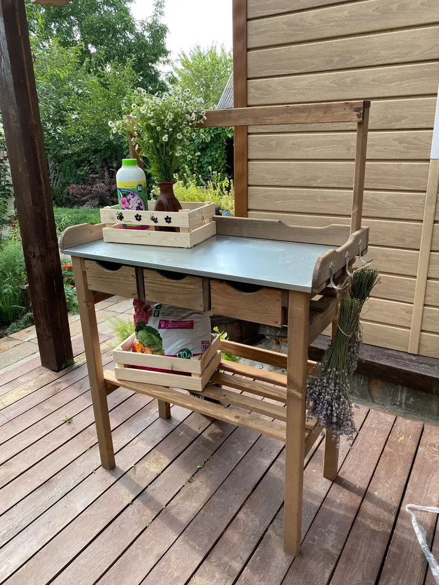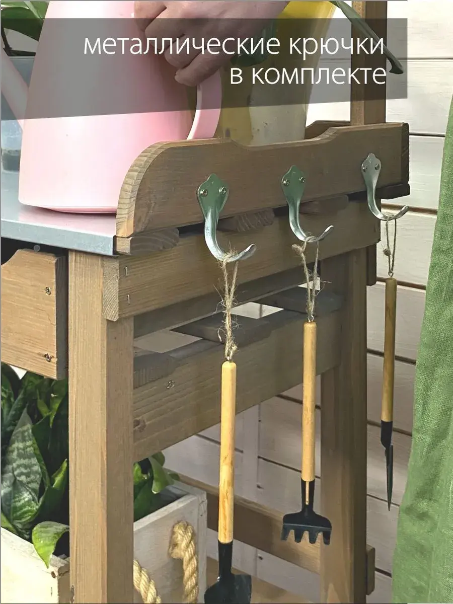 Стол деревянный предназначен для пересадки цветов и подготовки рассады, микрозелени. На нем можно разместить поддоны с саженцами или цветочные горшки, мини-парники, инструменты и аксессуары для рассады. Дополнительная полка в низу позволяет использовать стол садовый как напольную подставку стеллаж для растений, а ящики и крючки сбоку – экономить пространство на вашей мастерской, балконе или террасе. Столешница выполнена из массива сосны защищена оцинкованной поверхностью, что позволяет осуществлять сортировку овощей и промывку корнеплодов непосредственно на вашем садовом участке и просушку их на реечной полочке.Ящик для пересадки растений добавит нотку оригинальности вашему дому и даче балкону и лоджии беседке и веранде. СОЗДАДИМ УЮТ ВМЕСТЕ!!!Для поиска: балконный ящик/ горшок для рассады/ горшок для цветов/ дача/ сад/ огород/ теплица/ балкон/ лоджия/ веранда/ беседка/ садовый декор/ рассада/ мини огород/ мини цветник/ стол деревянный/ овощи/ семена/ цветы/ садовая мебель /домашний огород